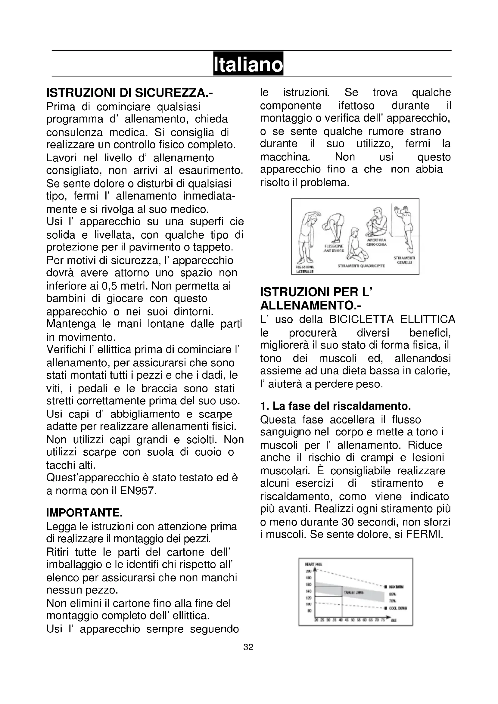 Prima di cominciare qualsiasi programma d’ allenamento, chieda consulenza medica. Si consiglia di realizzare un controllo fisico completo. Lavori nel livello d’ allenamento consigliato, non arrivi al esaurimento. Se sente dolore o disturbi di qualsiasi tipo, fermi l’ allenamento inmediata- mente e si rivolga al suo medico. Usi l’ apparecchio su una superfi cie solida e livellata, con qualche tipo di protezione per il pavimento o tappeto. Per motivi di sicurezza, l’ apparecchio dovrà avere attorno uno spazio non inferiore ai 0,5 metri. Non permetta ai bambini di giocare con questo apparecchio o nei suoi dintorni. Mantenga le mani lontane dalle parti in movimento. Verifichi l’ ellittica prima di cominciare l’ allenamento, per assicurarsi che sono stati montati tutti i pezzi e che i dadi, le viti, i pedali e le braccia sono stati stretti correttamente prima del suo uso. Usi capi d’ abbigliamento e scarpe adatte per realizzare allenamenti fisici. Non utilizzi capi grandi e sciolti. Non utilizzi scarpe con suola di cuoio o tacchi alti. Quest’apparecchio è stato testato ed è a norma con il EN957. IMPORTANTE. Legga le istruzioni con attenzione prima di realizzare il montaggio dei pezzi. Ritiri tutte le parti del cartone dell’ imballaggio e le identifi chi rispetto all’ elenco per assicurarsi che non manchi nessun pezzo. Non elimini il cartone fino alla fine del montaggio completo dell’ ellittica. Usi l’ apparecchio sempre seguendo le istruzioni. Se trova qualche componente ifettoso durante il montaggio o verifica dell’ apparecchio, o se sente qualche rumore strano durante il suo utilizzo, fermi la macchina. Non usi questo apparecchio fino a che non abbia risolto il problema.