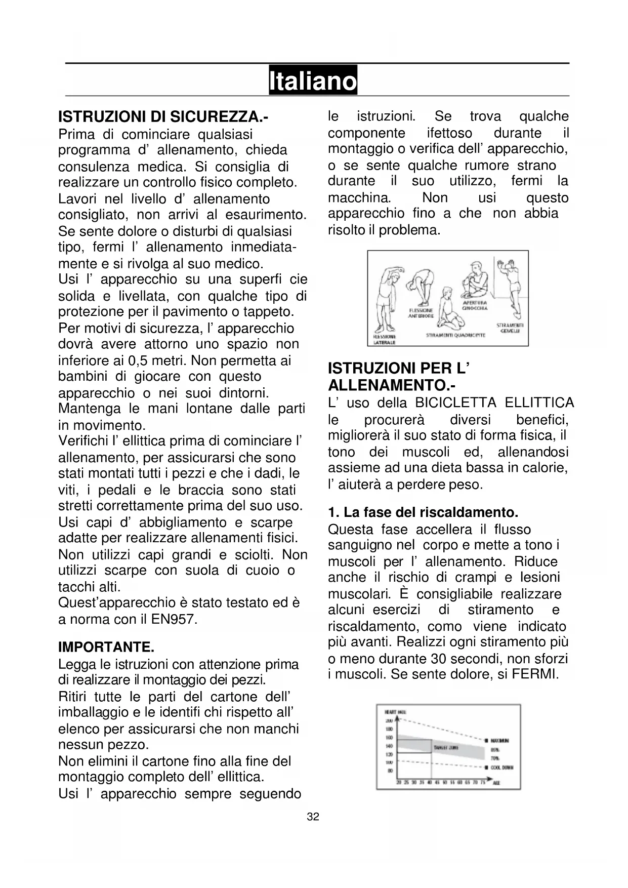 Prima di cominciare qualsiasi programma d’ allenamento, chieda consulenza medica. Si consiglia di realizzare un controllo fisico completo. Lavori nel livello d’ allenamento consigliato, non arrivi al esaurimento. Se sente dolore o disturbi di qualsiasi tipo, fermi l’ allenamento inmediata- mente e si rivolga al suo medico. Usi l’ apparecchio su una superfi cie solida e livellata, con qualche tipo di protezione per il pavimento o tappeto. Per motivi di sicurezza, l’ apparecchio dovrà avere attorno uno spazio non inferiore ai 0,5 metri. Non permetta ai bambini di giocare con questo apparecchio o nei suoi dintorni. Mantenga le mani lontane dalle parti in movimento. Verifichi l’ ellittica prima di cominciare l’ allenamento, per assicurarsi che sono stati montati tutti i pezzi e che i dadi, le viti, i pedali e le braccia sono stati stretti correttamente prima del suo uso. Usi capi d’ abbigliamento e scarpe adatte per realizzare allenamenti fisici. Non utilizzi capi grandi e sciolti. Non utilizzi scarpe con suola di cuoio o tacchi alti. Quest’apparecchio è stato testato ed è a norma con il EN957. IMPORTANTE. Legga le istruzioni con attenzione prima di realizzare il montaggio dei pezzi. Ritiri tutte le parti del cartone dell’ imballaggio e le identifi chi rispetto all’ elenco per assicurarsi che non manchi nessun pezzo. Non elimini il cartone fino alla fine del montaggio completo dell’ ellittica. Usi l’ apparecchio sempre seguendo le istruzioni. Se trova qualche componente ifettoso durante il montaggio o verifica dell’ apparecchio, o se sente qualche rumore strano durante il suo utilizzo, fermi la macchina. Non usi questo apparecchio fino a che non abbia risolto il problema.