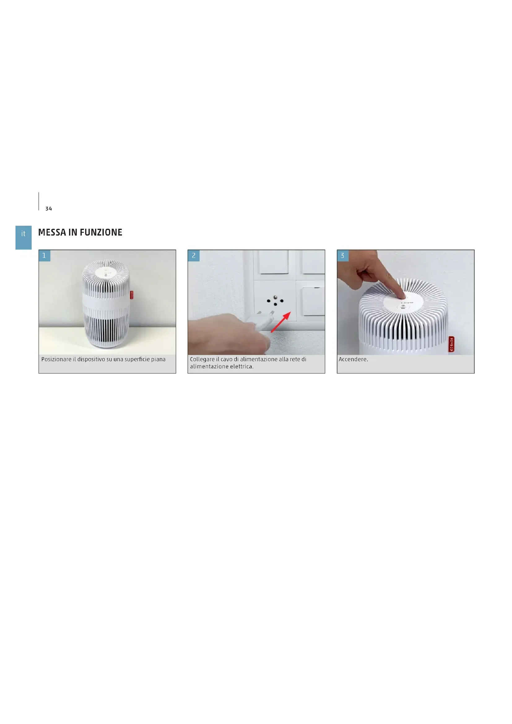 Tasto di accensione Accensione e spegnimento dell’apparecchio Pulsante stadio del ventilatore/ ripristino del filtro Toccando una volta si selezionano gli stadi del ventilatore L e H Tenere premuto per 3 sec. per ripristinare la luce del filtro36