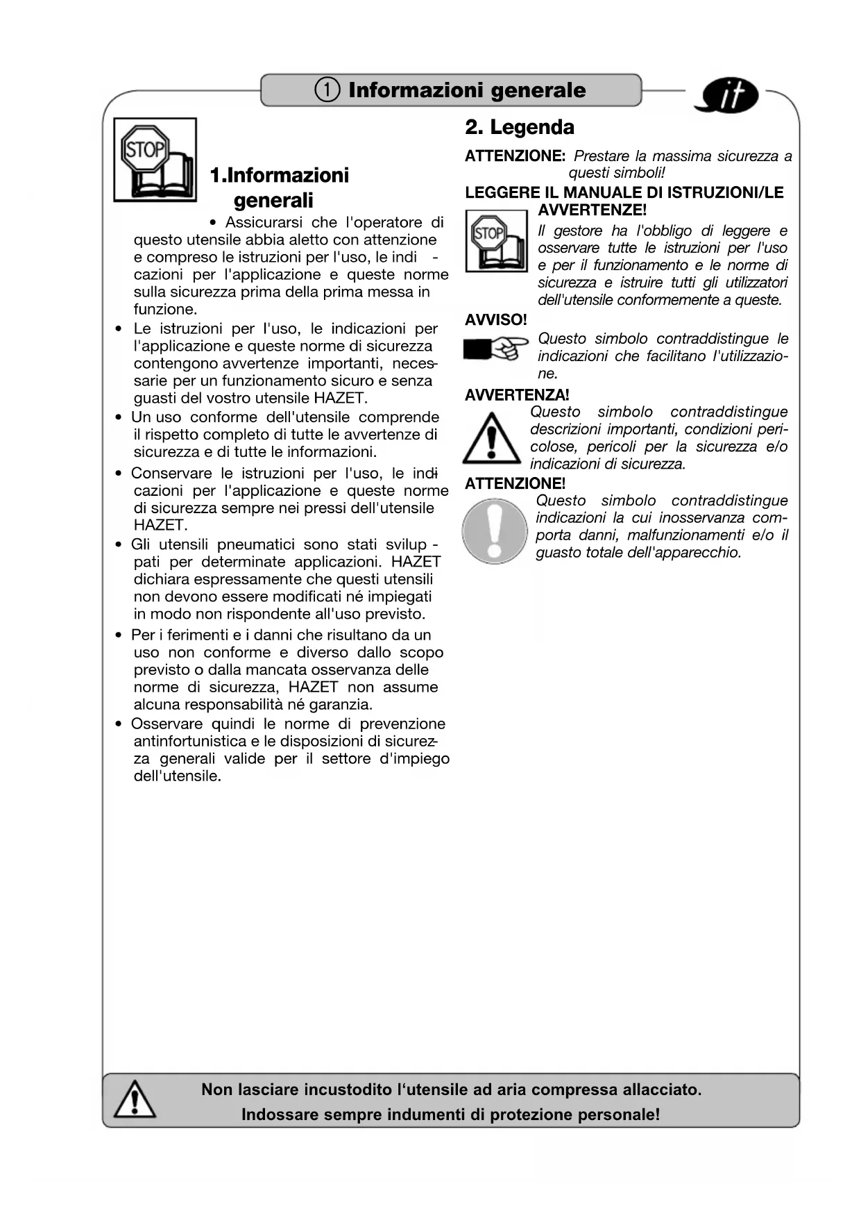 - Per i ferimenti e i danni che risultano da un uso non conforme e diverso dallo scopo previsto o dalla mancata osservanza delle norme di sicurezza, HAZET non assume alcuna responsabilità né garanzia.