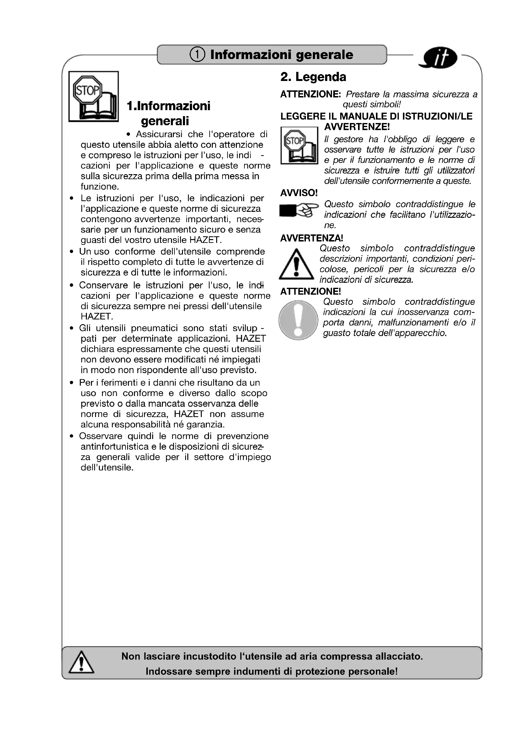 AVVERTENZE! Il gestore ha l'obbligo di leggere e osservare tutte le istruzioni per l'uso e per il funzionamento e le norme di sicurezza e istruire tutti gli utilizzatori dell'utensile conformemente a queste. AVVISO! Questo simbolo contraddistingue le indicazioni che facilitano l'utilizzazio- ne. AVVERTENZA!