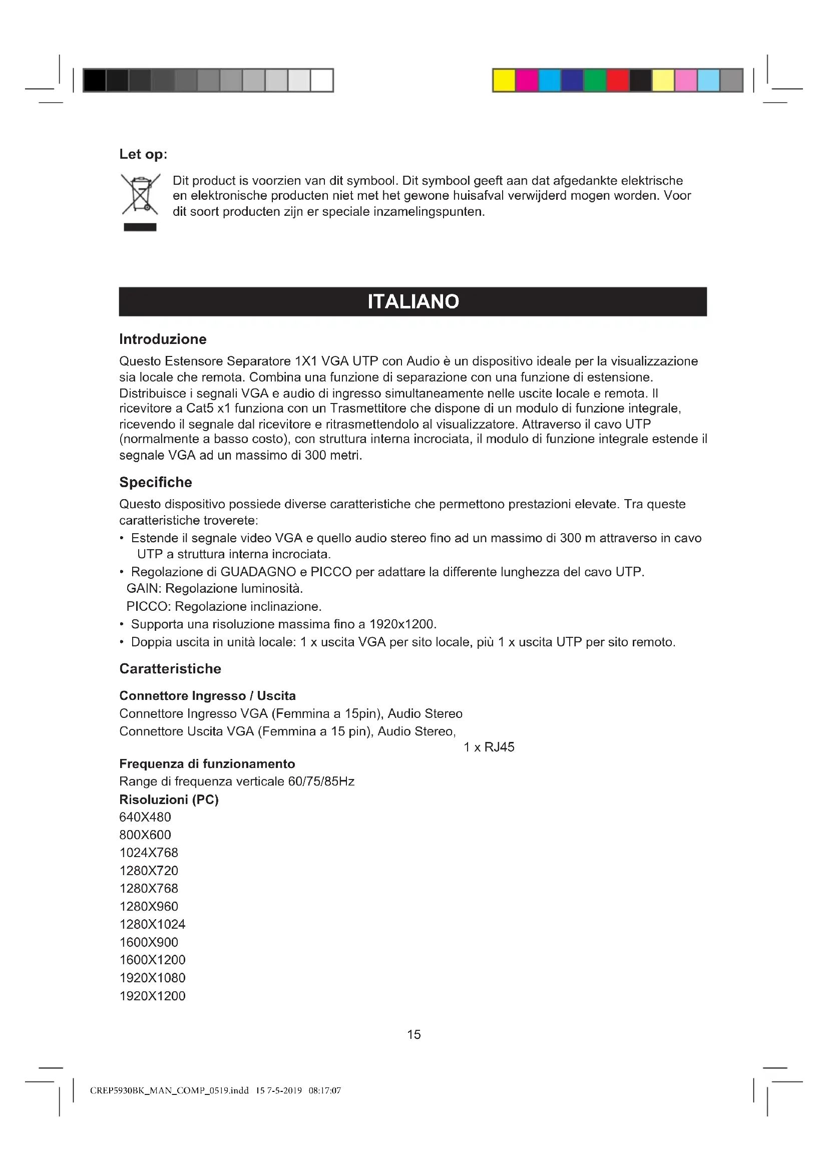 - Doppia uscita in unità locale: 1 x uscita VGA per sito locale, più 1 x uscita UTP per sito remoto. Caratteristiche Connettore Ingresso / Uscita Connettore Ingresso VGA (Femmina a 15pin), Audio Stereo Connettore Uscita VGA (Femmina a 15 pin), Audio Stereo, 1 x RJ45 Frequenza di funzionamento Range di frequenza verticale 60/75/85Hz Risoluzioni (PC) 640X480 800X600 1024X768 1280X720 1280X768 1280X960 1280X1024 1600X900 1600X1200 1920X1080 1920X1200 CREP5930BK_MAN_COMP_0519.indd 15 7-5-2019 08:17:0716 Meccanica Dimensione di estensore separatore VGA UTP 1 x 1 100×65×25,5mm Peso di estensore separatore VGA UTP 1 x 1 208g Dimensione del Ricevitore (P-L-A) 81,5×43×23mm Peso del Ricevitore (Netto) 108g Ambiente Temperatura di funzionamento 0ºC a +70ºC Umidità di funzionamento 10% a 85 % RH (senza condensazione) Temperatura di conservazione -10ºC a +80ºC Umidità di conservazione 5% a 90 % RH (senza condensazione) Requisiti di alimentazione: Alimentazione per estensore separatore VGA UTP 1 x 1 5V@2A, max 5W Alimentazione per Ricevitore 5V@2A, max 5W Approvazioni Normative Unità del convertitore FCC,CE,UL Alimentazione UL,CE,FCC Nota: Le speciche sono soggette a modica senza preavviso. Contenuto della confezione Prima di cercare di utilizzare questa unità, si prega di controllare la confezione ed assicurarsi che gli articoli seguenti siano contenuti nella scatola di spedizione: