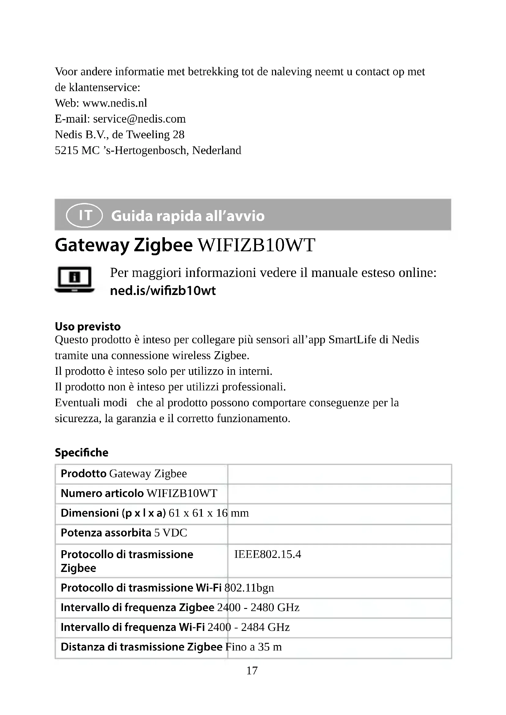 Guida rapida all’avvio Gateway Zigbee WIFIZB10WT Per maggiori informazioni vedere il manuale esteso online: ned.is/wizb10wt Uso previsto Questo prodotto è inteso per collegare più sensori all’app SmartLife di Nedis tramite una connessione wireless Zigbee. Il prodotto è inteso solo per utilizzo in interni. Il prodotto non è inteso per utilizzi professionali. Eventuali modiche al prodotto possono comportare conseguenze per la sicurezza, la garanzia e il corretto funzionamento. Speciche Prodotto Gateway Zigbee Numero articolo WIFIZB10WT Dimensioni (p x l x a) 61 x 61 x 16 mm Potenza assorbita 5 VDC Protocollo di trasmissione Zigbee IEEE802.15.4 Protocollo di trasmissione Wi-Fi 802.11bgn Intervallo di frequenza Zigbee 2400 - 2480 GHz Intervallo di frequenza Wi-Fi 2400 - 2484 GHz Distanza di trasmissione Zigbee Fino a 35 m18 Distanza di trasmissione Wi-Fi Fino a 90 m Potenza massima di trasmissione 19 dB Guadagno antenna 2,5 dB Temperatura di funzionamento -10 °C - 55 °C Umidità d’esercizio < 90 % UR Supporto sistema operativo Android, iOS Parti principali (immagine A)