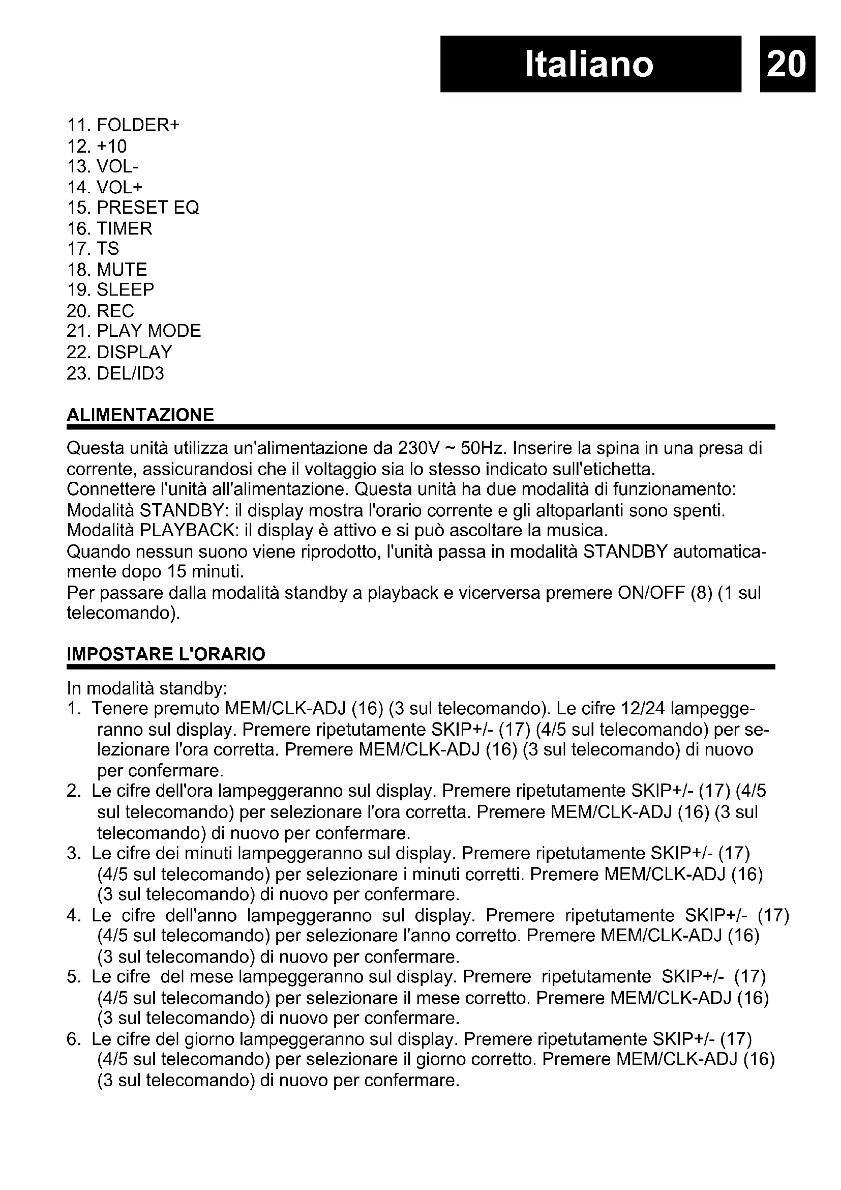 - Le cître dell'ora lampeggeranno sul display. Premere ripeturamente SKIP + / - (17) (4/5 sul telecomando) per selezionare l'ora corretta. Premere MEM/CLK-ADJ (16) (3 sul telecomando) di nuovo per confermare.
