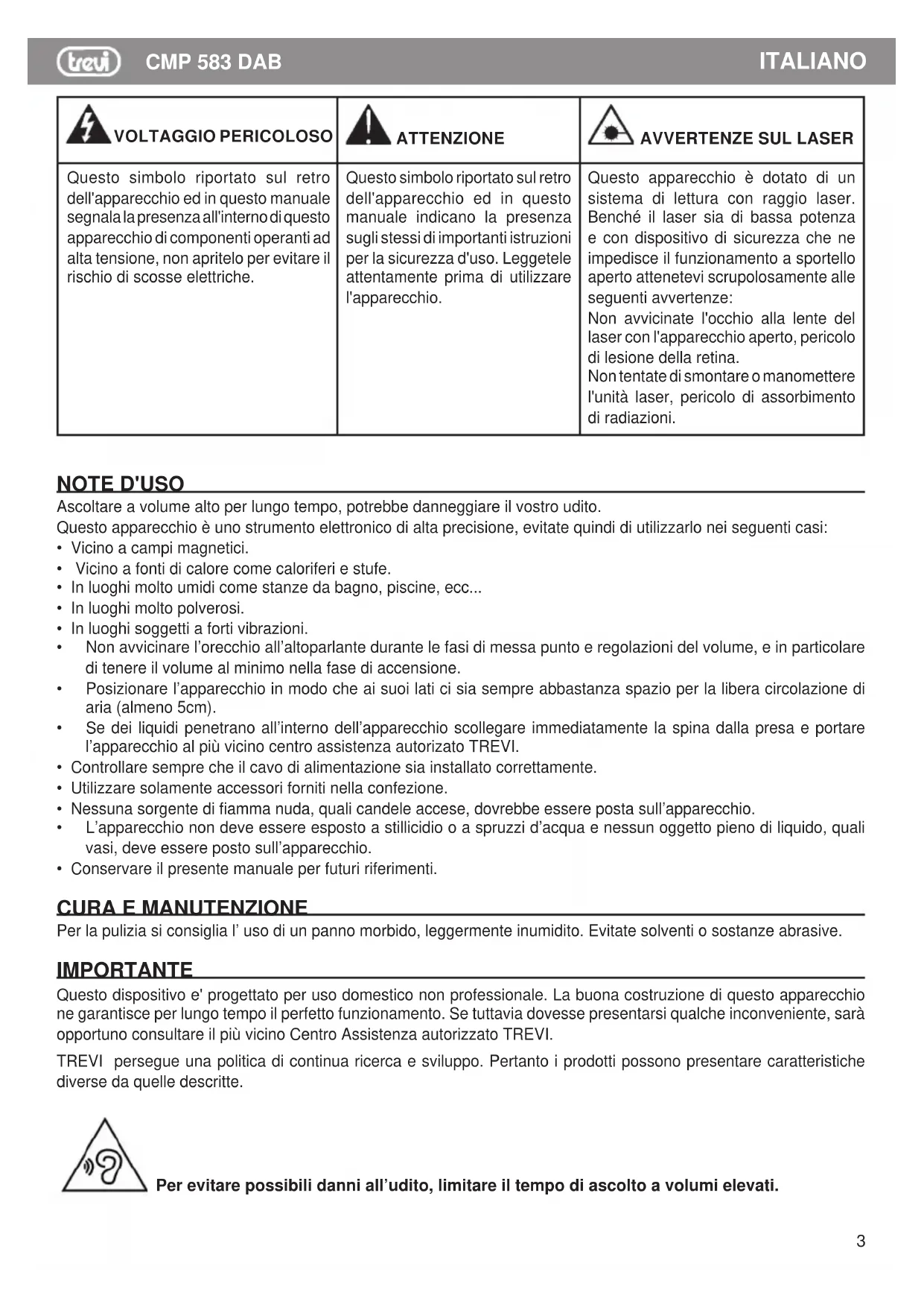Scarica le istruzioni per il tuo Lettore/registratore cd in formato PDF gratuitamente! Trova il tuo manuale CMP 583 DAB - Trevi e riprendi in mano il tuo dispositivo elettronico. In questa pagina sono pubblicati tutti i documenti necessari per l'utilizzo del tuo dispositivo. CMP 583 DAB del marchio Trevi.