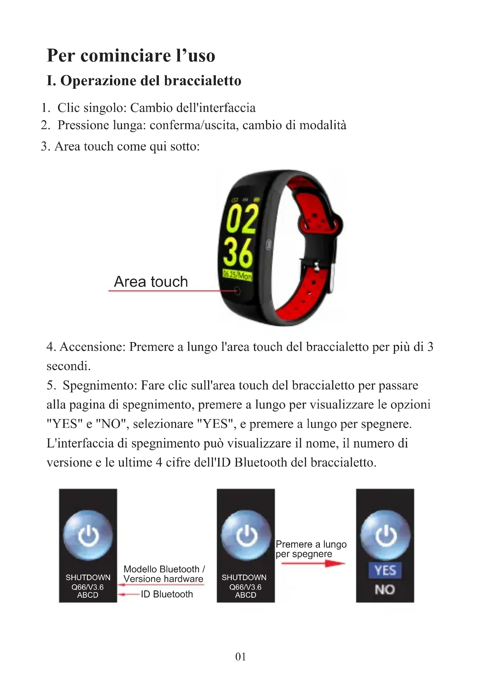 alla pagina di spegnimento, premere a lungo per visualizzare le opzioni "YES" e "NO", selezionare "YES", e premere a lungo per spegnere. L'interfaccia di spegnimento può visualizzare il nome, il numero di versione e le ultime 4 cifre dell'ID Bluetooth del braccialetto.