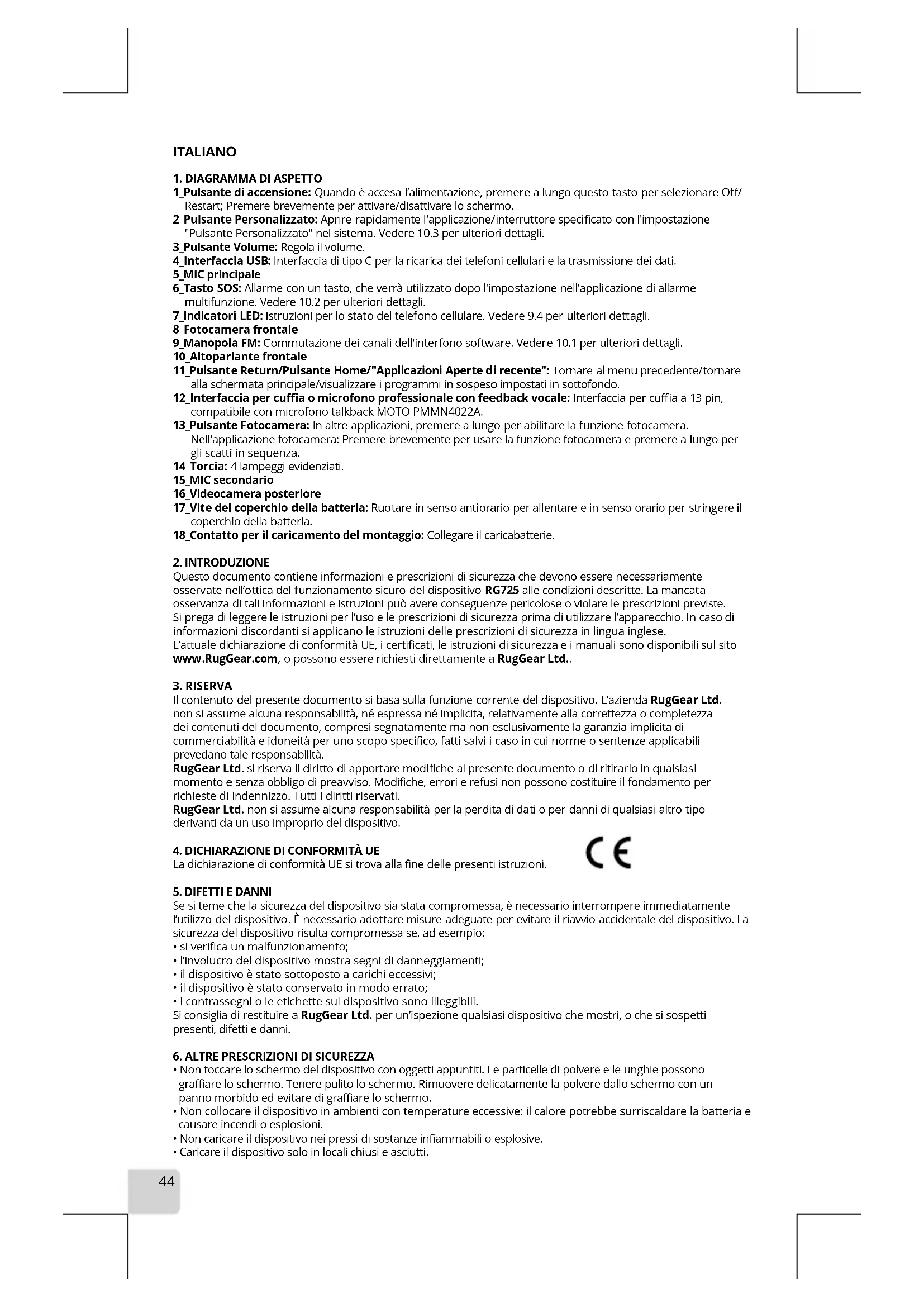 Questo documento contiene informazioni e prescrizioni di sicurezza che devono essere necessariamente osservate nell’ottica del funzionamento sicuro del dispositivo RG725 alle condizioni descritte. La mancata osservanza di tali informazioni e istruzioni può avere conseguenze pericolose o violare le prescrizioni previste. Si prega di leggere le istruzioni per l’uso e le prescrizioni di sicurezza prima di utilizzare l’apparecchio. In caso di informazioni discordanti si applicano le istruzioni delle prescrizioni di sicurezza in lingua inglese. L’attuale dichiarazione di conformità UE, i certificati, le istruzioni di sicurezza e i manuali sono disponibili sul sito www.RugGear.com, o possono essere richiesti direttamente a RugGear Ltd..
