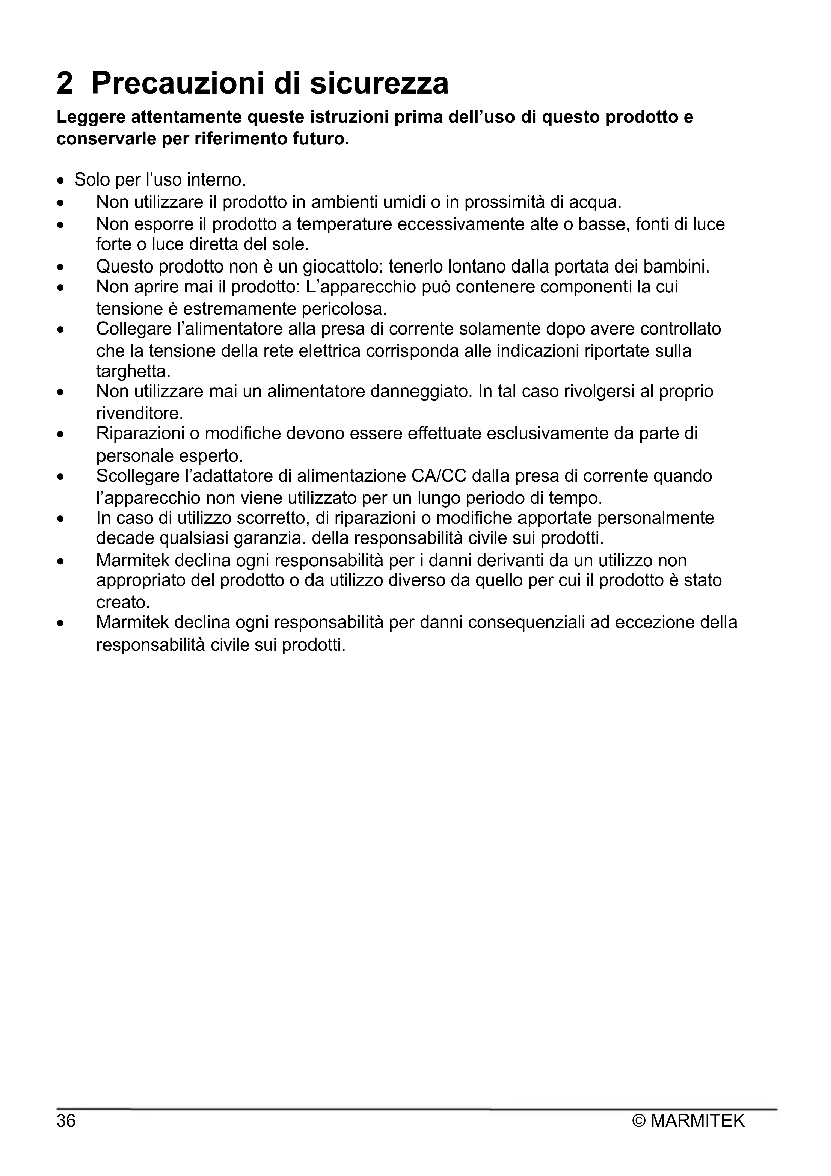 Marmitek è un marchio commerciale di Germatron BV. Split 612 UHD 2.0™ è un marchio commerciale di Marmitek BV. Tutti i diritti riservati. Marmitek si è impegnata perché le informazioni contenute in questo manuale fossero il più possibile precise. Marmitek declina ogni responsabilità per eventuali errori di stampa. I diritti d'autore e tutti gli altri diritti di proprietà intellettuale sul contenuto (inclusi ma non limitati a numeri di modelli, software, audio, video, testi e fotografie) spettano a Marmitek BV. È strettamente proibito ogni uso del Contenuto, incluse senza limitazioni la distribuzione, riproduzione, modifica, pubblicazione o trasmissione senza previa autorizzazione scritta da parte di Marmitek. Tutti i diritti d’autore e altri diritti di proprietà intellettuale su tutte le riproduzioni devono essere conservati. I nomi di altre società e prodotti qui menzionati potrebbero essere marchi delle rispettive società. La citazione di prodotti di terze parti è a solo scopo informativo e non costituisce alcun impegno o raccomandazione. Marmitek declina ogni responsabilità riguardo l’uso e le prestazioni di questi prodotti. Marmitek BV - PO Box 4257 - 5604 EG Eindhoven Paesi BassiSPLIT 612 UHD 2.0™