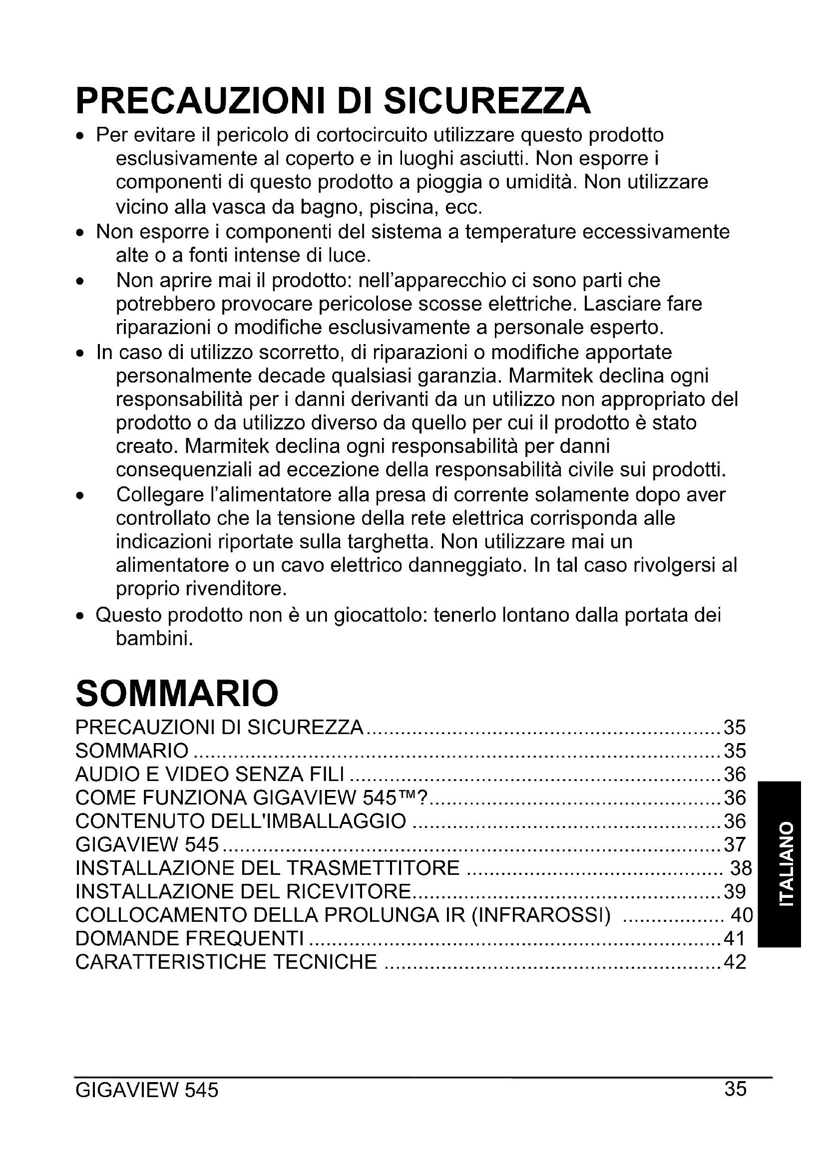x Per evitare il pericolo di cortocircuito utilizzare questo prodotto esclusivamente al coperto e in luoghi asciutti. Non esporre i componenti di questo prodotto a pioggia o umidità. Non utilizzare vicino alla vasca da bagno, piscina, ecc. x Non esporre i componenti del sistema a temperature eccessivamente alte o a fonti intense di luce. x Non aprire mai il prodotto: nell’apparecchio ci sono parti che potrebbero provocare pericolose scosse elettriche. Lasciare fare riparazioni o modifiche esclusivamente a personale esperto. x In caso di utilizzo scorretto, di riparazioni o modifiche apportate personalmente decade qualsiasi garanzia. Marmitek declina ogni responsabilità per i danni derivanti da un utilizzo non appropriato del prodotto o da utilizzo diverso da quello per cui il prodotto è stato creato. Marmitek declina ogni responsabilità per danni consequenziali ad eccezione della responsabilità civile sui prodotti. x Collegare l’alimentatore alla presa di corrente solamente dopo aver controllato che la tensione della rete elettrica corrisponda alle indicazioni riportate sulla targhetta. Non utilizzare mai un alimentatore o un cavo elettrico danneggiato. In tal caso rivolgersi al proprio rivenditore. x Questo prodotto non è un giocattolo: tenerlo lontano dalla portata dei bambini. SOMMARIO