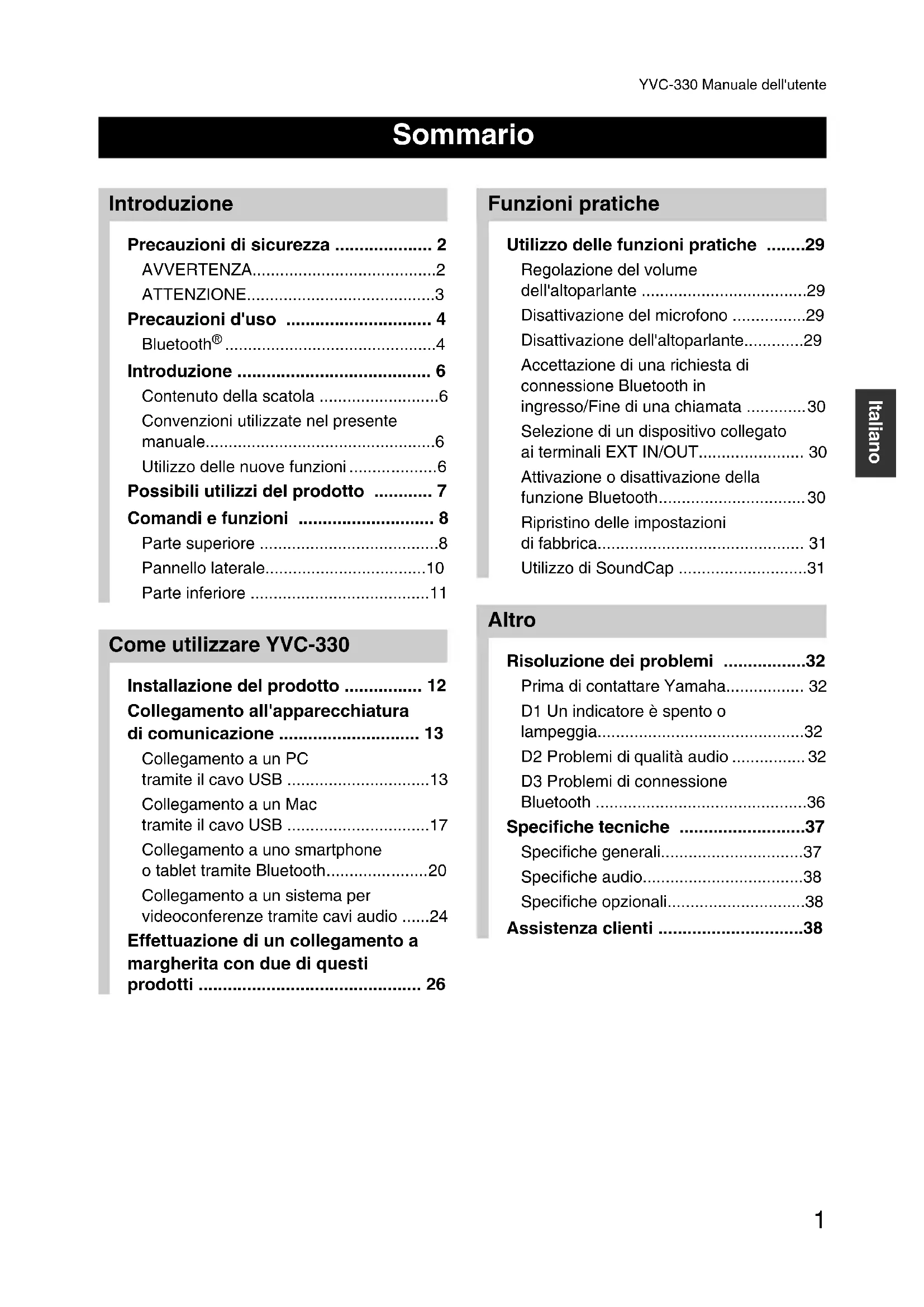 - Yamaha non garantisce il funzionamento di tutte le connessioni wireless tra il prodotto e i dispositivi compatibili con Bluetooth. Precauzioni d'uso Bluetooth ®YVC-330 Manuale dell'utente