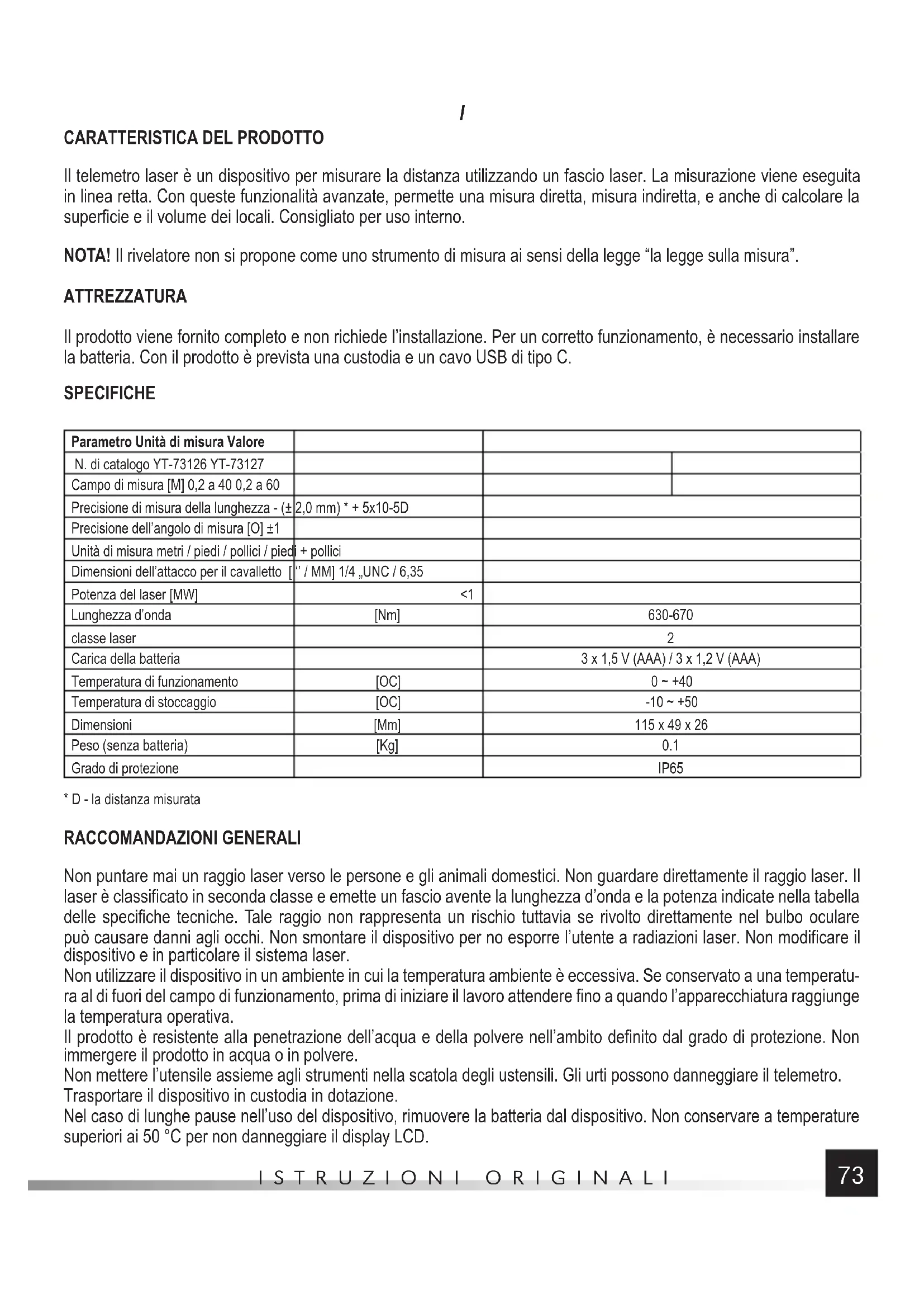 Il telemetro laser è un dispositivo per misurare la distanza utilizzando un fascio laser. La misurazione viene eseguita in linea retta. Con queste funzionalità avanzate, permette una misura diretta, misura indiretta, e anche di calcolare la superficie e il volume dei locali. Consigliato per uso interno. NOTA! Il rivelatore non si propone come uno strumento di misura ai sensi della legge “la legge sulla misura”. ATTREZZATURA Il prodotto viene fornito completo e non richiede l’installazione. Per un corretto funzionamento, è necessario installare la batteria. Con il prodotto è prevista una custodia e un cavo USB di tipo C. SPECIFICHE Parametro Unità di misura Valore N. di catalogo YT-73126 YT-73127 Campo di misura [M] 0,2 a 40 0,2 a 60 Precisione di misura della lunghezza - (± 2,0 mm) * + 5x10-5D Precisione dell’angolo di misura [O] ±1 Unità di misura metri / piedi / pollici / piedi + pollici Dimensioni dell’attacco per il cavalletto [ ‘’ / MM] 1/4 „UNC / 6,35 Potenza del laser [MW] <1 Lunghezza d’onda [Nm] 630-670 classe laser 2 Carica della batteria 3 x 1,5 V (AAA) / 3 x 1,2 V (AAA) Temperatura di funzionamento [OC] 0 ~ +40 Temperatura di stoccaggio [OC] -10 ~ +50 Dimensioni [Mm] 115 x 49 x 26 Peso (senza batteria) [Kg] 0.1 Grado di protezione IP65