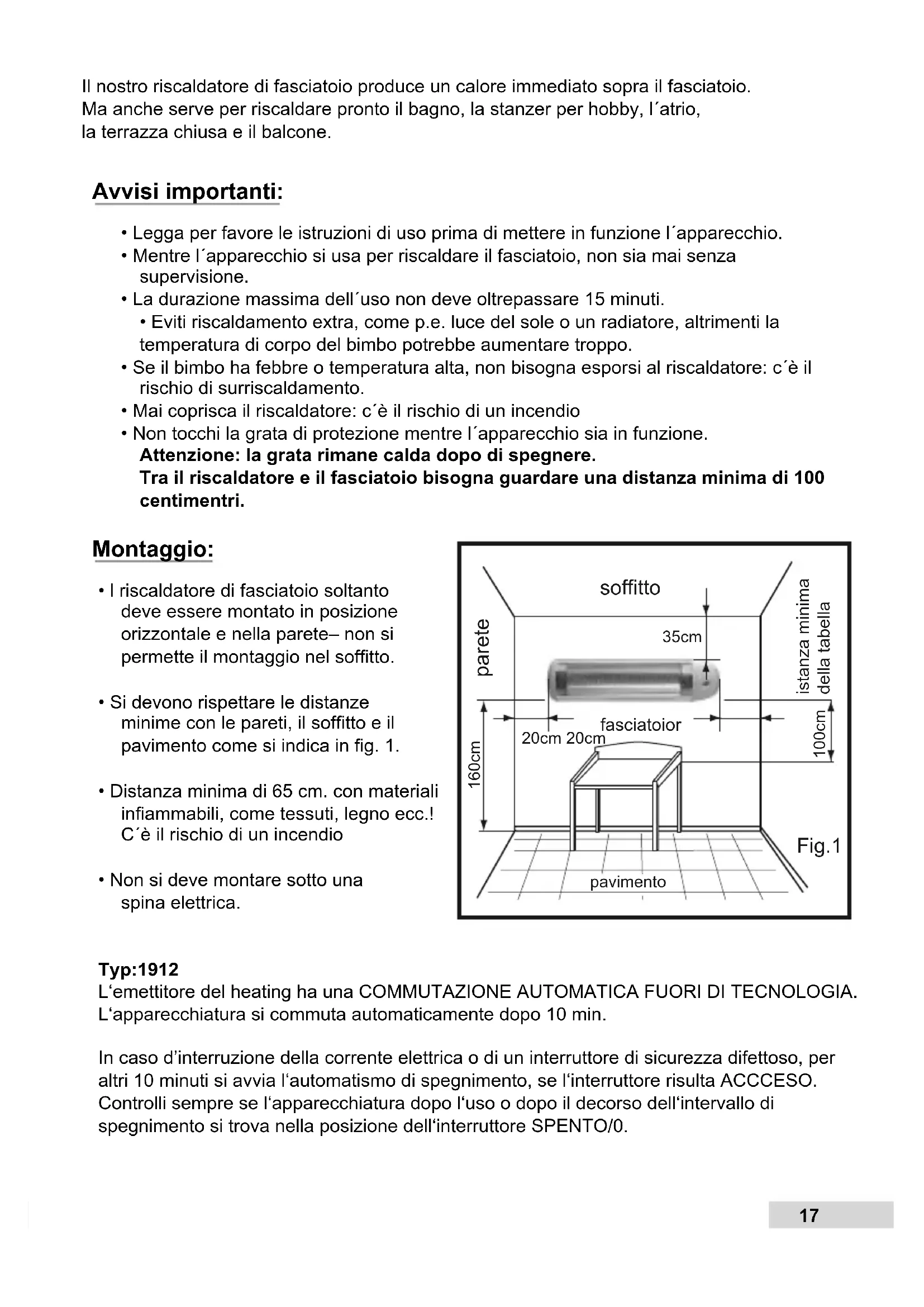 - Non si deve montare sotto una spina elettrica. Typ:1912 L‘emettitore del heating ha una COMMUTAZIONE AUTOMATICA FUORI DI TECNOLOGIA. L‘apparecchiatura si commuta automaticamente dopo 10 min. In caso d’interruzione della corrente elettrica o di un interruttore di sicurezza difettoso, per altri 10 minuti si avvia l‘automatismo di spegnimento, se l‘interruttore risulta ACCCESO. Controlli sempre se l‘apparecchiatura dopo l‘uso o dopo il decorso dell‘intervallo di spegnimento si trova nella posizione dell‘interruttore SPENTO/0.