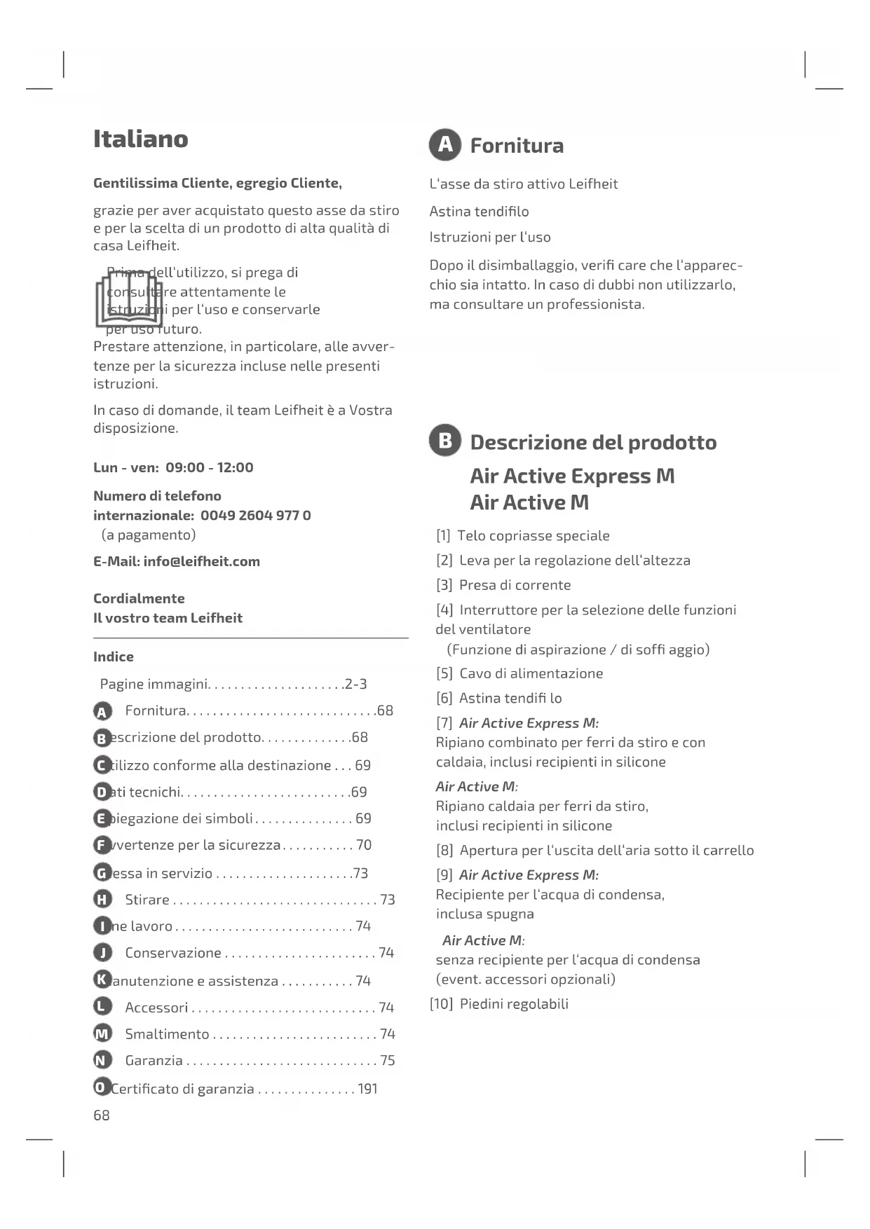 Fornitura Italiano Gentilissima Cliente, egregio Cliente, grazie per aver acquistato questo asse da stiro e per la scelta di un prodotto di alta qualità di casa Leifheit. Prima dell‘utilizzo, si prega di consultare attentamente le istruzioni per l‘uso e conservarle per uso futuro. Prestare attenzione, in particolare, alle avver- tenze per la sicurezza incluse nelle presenti istruzioni. In caso di domande, il team Leifheit è a Vostra disposizione. Lun - ven: 09:00 - 12:00 Numero di telefono internazionale: 0049 2604 977 0 (a pagamento) E-Mail: info@leifheit.com Cordialmente Il vostro team Leifheit Air Active Express M Air Active M [1] Telo copriasse speciale [2] Leva per la regolazione dell‘altezza [3] Presa di corrente [4] Interruttore per la selezione delle funzioni del ventilatore (Funzionediaspirazione/disofaggio) [5] Cavo di alimentazione [6] Astinatendilo [7] Air Active Express M: Ripiano combinato per ferri da stiro e con caldaia, inclusi recipienti in silicone Air Active M: Ripiano caldaia per ferri da stiro, inclusi recipienti in silicone [8] Apertura per l‘uscita dell‘aria sotto il carrello [9] Air Active Express M: Recipiente per l‘acqua di condensa, inclusa spugna Air Active M: senza recipiente per l‘acqua di condensa (event. accessori opzionali) [10] Piedini regolabili Descrizione del prodotto