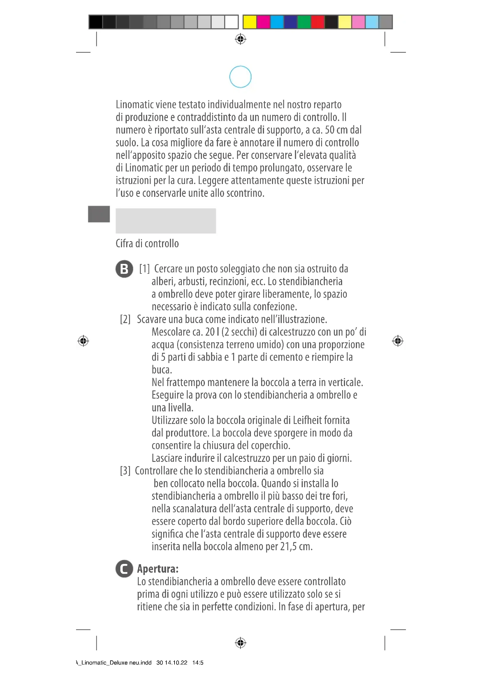 Pulire di tanto in tanto l‘asta centrale di supporto con un panno umido e un po’ di detergente per la casa. È anche possibile spruzzare delle piccole quantità di spray deter- gente su un panno e stronare l‘asta centrale di supporto. Quando lo stendibiancheria a ombrello è aperto è possibile spruzzare un po‘ di spray detergente nelle aperture per il ritiro dei li nei bracci portanti. Pulire regolarmente la boccola a terra da sabbia, acqua e terra. *BA_Linomatic_Deluxe neu.indd 31 14.10.22 14:56Avvertenze di sicurezza: Lo stendibiancheria a ombrello Linomatic di Leifheit è stato concepito per l’uso all’esterno e può essere utilizzato solo in conformità alle informazioni contenute nelle presenti istruzioni per l‘uso. È vietato qualsiasi utilizzo improprio. I bambini potrebbero rischiare lo strangola- mento con i li durante l’uso dello stendi- biancheria a ombrello. Per evitare strozza- ture e attorcigliamenti con i li, tenere lo stendibiancheria a ombrello fuori dalla portata dei bambini. I li possono avvolgersi intorno al collo del bambino. Non annodare i li. Assicurarsi che i li non si attorciglino fra di loro e non formino anelli. Prima di ogni utilizzo controllare che lo stendibiancheria a ombrello non sia danneggiato. Uno stendibiancheria a ombrello danneggiato non può più essere utilizzato. Vor dem Önen sicherstellen, dass der Deckel der Bodenhülse an dem entsprechenden Gegenstück am Standrohr arretiert ist.