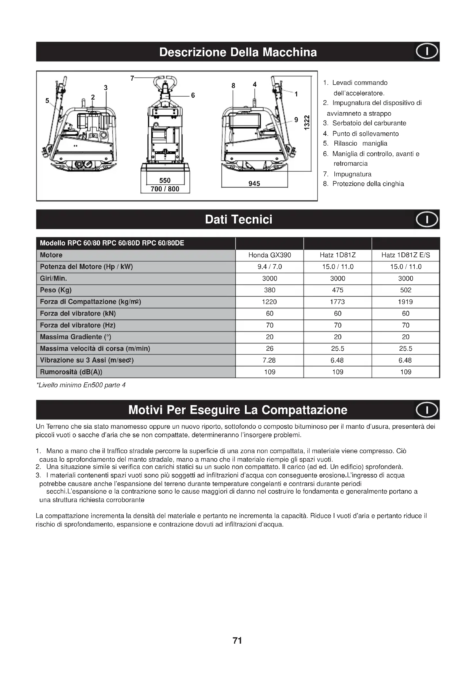 Dati Tecnici *Livello minimo En500 parte 4 Motivi Per Eseguire La Compattazione Un Terreno che sia stato manomesso oppure un nuovo riporto, sottofondo o composto bituminoso per il manto d’usura, presenterà dei piccoli vuoti o sacche d’aria che se non compattate, determineranno l’insorgere problemi. 1. Mano a mano che il traf¿ co stradale percorre la super¿ cie di una zona non compattata, il materiale viene compresso. Ciò causa lo sprofondamento del manto stradale, mano a mano che il materiale riempie gli spazi vuoti. 2. Una situazione simile si veri¿ ca con carichi statici su un suolo non compattato. Il carico (ad ed. Un edi¿ cio) sprofonderà. 3. I materiali contenenti spazi vuoti sono più soggetti ad in¿ ltrazioni d’acqua con conseguente erosione.L’ingresso di acqua potrebbe causare anche l’espansione del terreno durante temperature congelanti e contrarsi durante periodi secchi.L’espansione e la contrazione sono le cause maggiori di danno nel costruire le fondamenta e generalmente portano a una struttura richiesta corroborante La compattazione incrementa la densità del materiale e pertanto ne incrementa la capacità. Riduce I vuoti d’aria e pertanto riduce il rischio di sprofondamento, espansione e contrazione dovuti ad in¿ ltrazioni d’acqua.