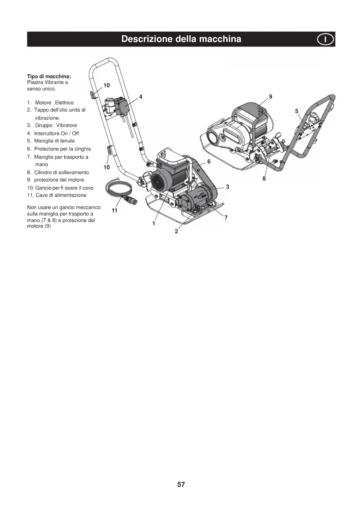 Non usare un gancio meccanico sulla maniglia per trasporto a mano (7 & 8) e protezione del motore (9) Descrizione della macchina