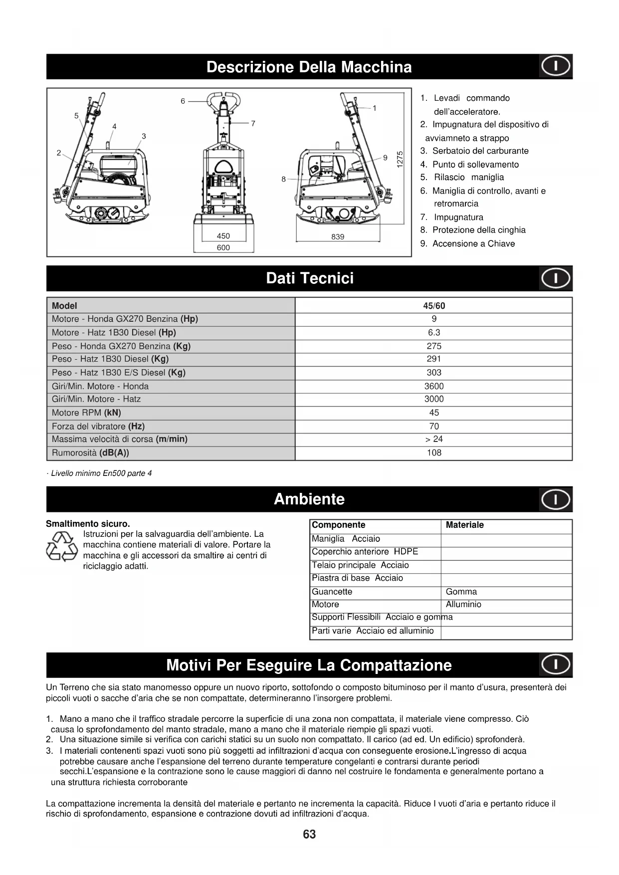 - Livello minimo En500 parte 4 Ambiente Smaltimento sicuro. Istruzioni per la salvaguardia dell’ambiente. La macchina contiene materiali di valore. Portare la macchina e gli accessori da smaltire ai centri di riciclaggio adatti. Componente Materiale Maniglia Acciaio Coperchio anteriore HDPE Telaio principale Acciaio Piastra di base Acciaio Guancette Gomma Motore Alluminio Supporti Flessibili Acciaio e gomma Parti varie Acciaio ed alluminio Motivi Per Eseguire La Compattazione Un Terreno che sia stato manomesso oppure un nuovo riporto, sottofondo o composto bituminoso per il manto d’usura, presenterà dei piccoli vuoti o sacche d’aria che se non compattate, determineranno l’insorgere problemi. 0DQRDPDQRFKHLOWUDI¿FRVWUDGDOHSHUFRUUHODVXSHU¿FLHGLXQD]RQDQRQFRPSDWWDWDLOPDWHULDOHYLHQHFRPSUHVVR&Lz causa lo sprofondamento del manto stradale, mano a mano che il materiale riempie gli spazi vuoti. 8QDVLWXD]LRQHVLPLOHVLYHUL¿FDFRQFDULFKLVWDWLFLVXXQVXRORQRQFRPSDWWDWR,OFDULFRDGHG8QHGL¿FLRVSURIRQGHUj ,PDWHULDOLFRQWHQHQWLVSD]LYXRWLVRQRSLVRJJHWWLDGLQ¿OWUD]LRQLG¶DFTXDFRQFRQVHJXHQWHHURVLRQH.L’ingresso di acqua potrebbe causare anche l’espansione del terreno durante temperature congelanti e contrarsi durante periodi secchi.L’espansione e la contrazione sono le cause maggiori di danno nel costruire le fondamenta e generalmente portano a una struttura richiesta corroborante La compattazione incrementa la densità del materiale e pertanto ne incrementa la capacità. Riduce I vuoti d’aria e pertanto riduce il