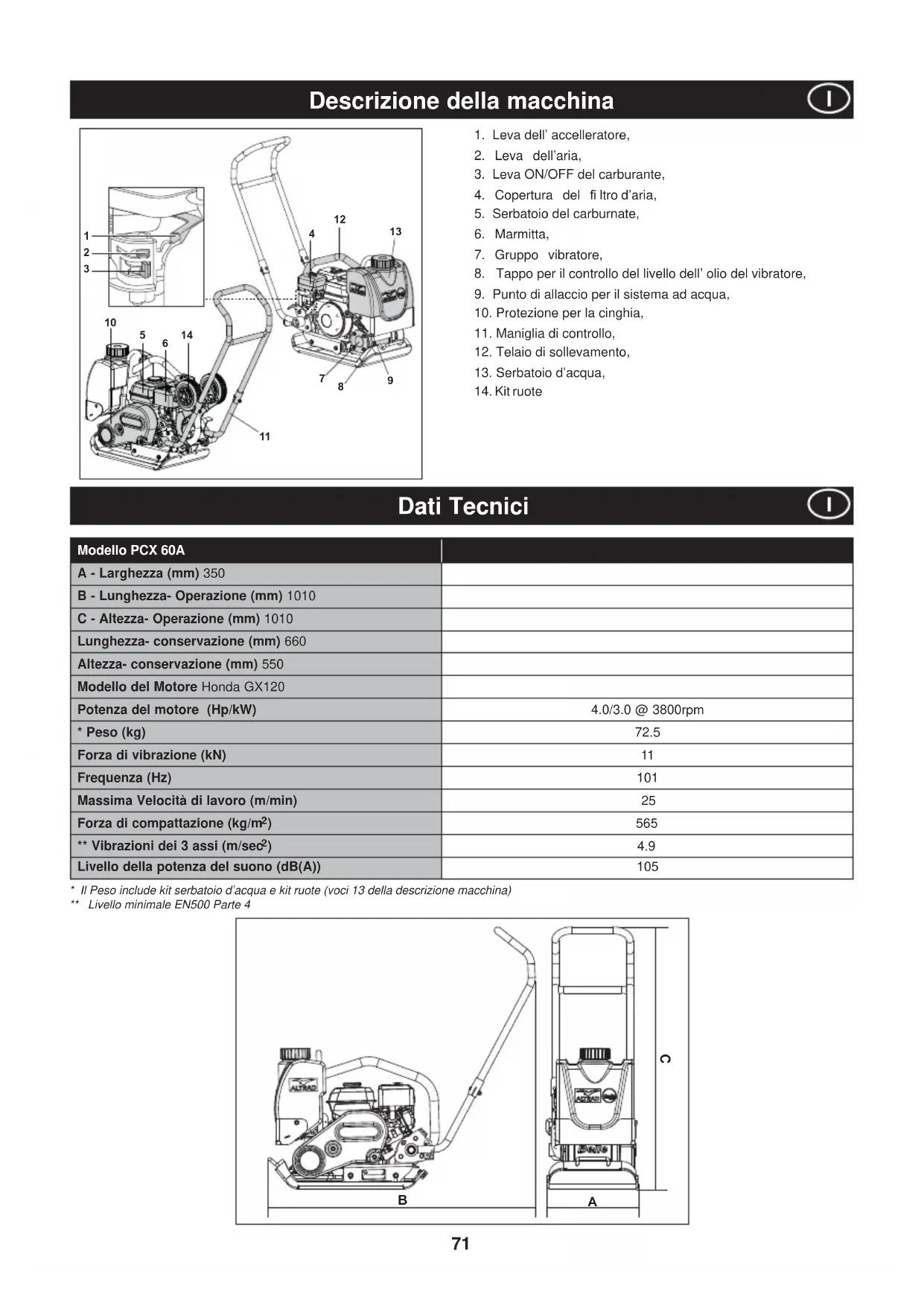 - Il Peso include kit serbatoio d’acqua e kit ruote (voci 13 della descrizione macchina)** Livello minimale EN500 Parte 4 Modello PCX 60A A - Larghezza (mm) 350 B - Lunghezza- Operazione (mm) 1010 C - Altezza- Operazione (mm) 1010 Lunghezza- conservazione (mm) 660 Altezza- conservazione (mm) 550 Modello del Motore Honda GX120 Potenza del motore (Hp/kW) 4.0/3.0 @ 3800rpm