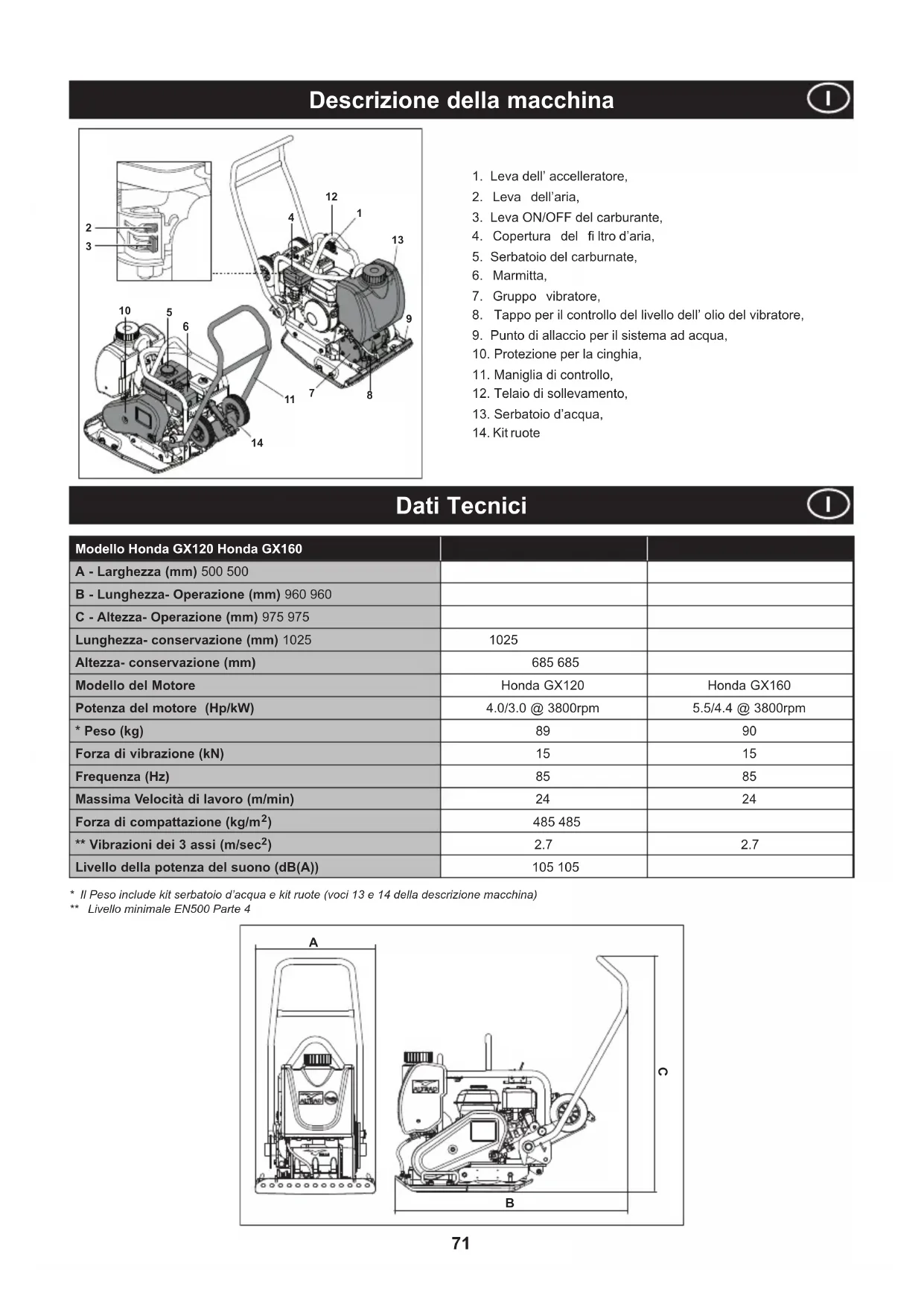 - Il Peso include kit serbatoio d’acqua e kit ruote (voci 13 e 14 della descrizione macchina)** Livello minimale EN500 Parte 4