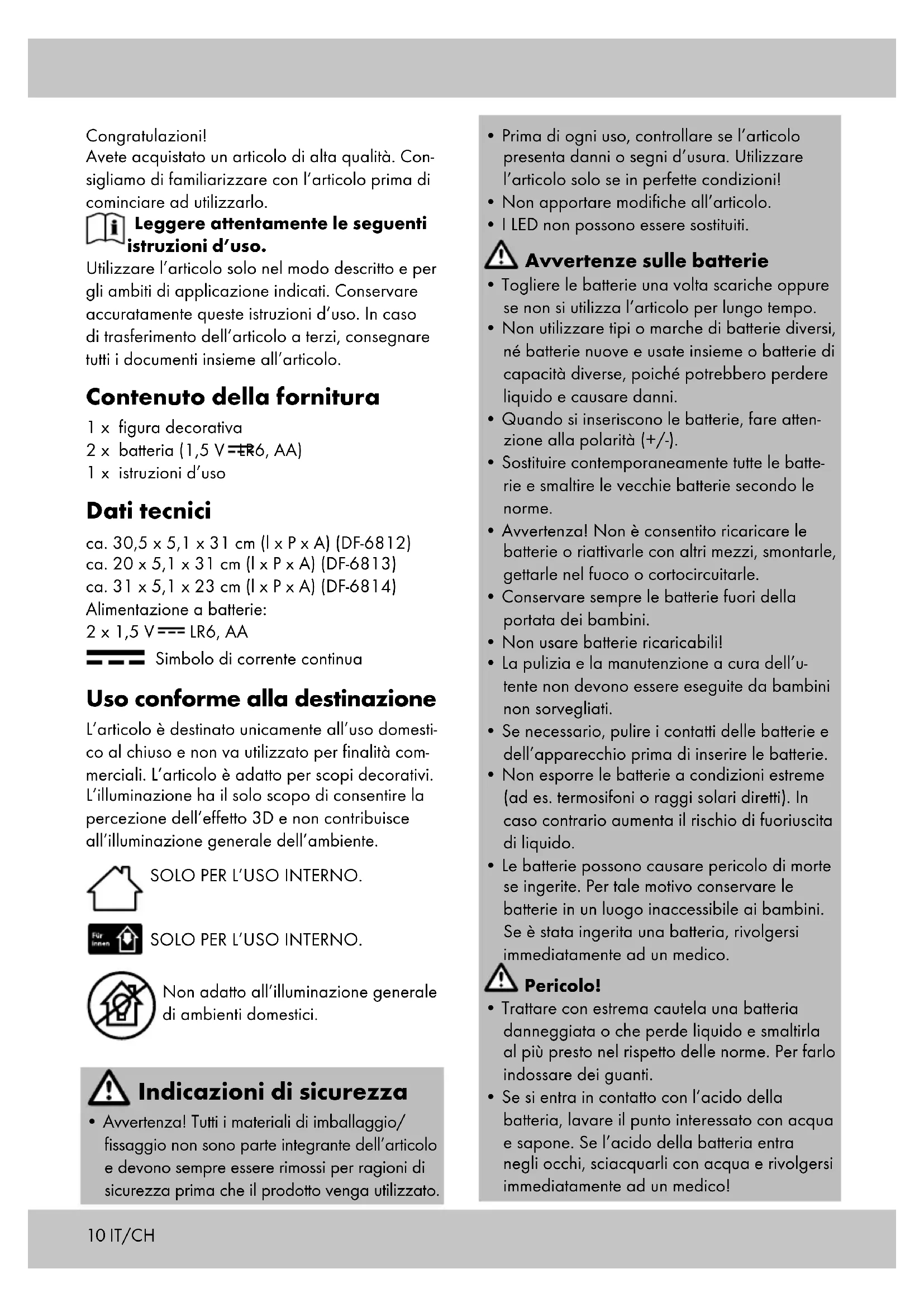 - Se si entra in contatto con l’acido della batteria, lavare il punto interessato con acqua e sapone. Se l’acido della batteria entra negli occhi, sciacquarli con acqua e rivolgersi immediatamente ad un medico! Congratulazioni! Avete acquistato un articolo di alta qualità. Con- sigliamo di familiarizzare con l’articolo prima di cominciare ad utilizzarlo. Leggere attentamente le seguenti istruzioni d’uso. Utilizzare l’articolo solo nel modo descritto e per gli ambiti di applicazione indicati. Conservare accuratamente queste istruzioni d’uso. In caso di trasferimento dell’articolo a terzi, consegnare tutti i documenti insieme all’articolo. Contenuto della fornitura 1 x figura decorativa 2 x batteria (1,5 V LR6, AA) 1 x istruzioni d’uso Dati tecnici ca. 30,5 x 5,1 x 31 cm (l x P x A) (DF-6812) ca. 20 x 5,1 x 31 cm (l x P x A) (DF-6813) ca. 31 x 5,1 x 23 cm (l x P x A) (DF-6814) Alimentazione a batterie: 2 x 1,5 V LR6, AA Simbolo di corrente continua Uso conforme alla destinazione L’articolo è destinato unicamente all’uso domesti- co al chiuso e non va utilizzato per finalità com- merciali. L’articolo è adatto per scopi decorativi. L’illuminazione ha il solo scopo di consentire la percezione dell’effetto 3D e non contribuisce all’illuminazione generale dell’ambiente. SOLO PER L’USO INTERNO. SOLO PER L’USO INTERNO. Non adatto all’illuminazione generale di ambienti domestici. Indicazioni di sicurezza