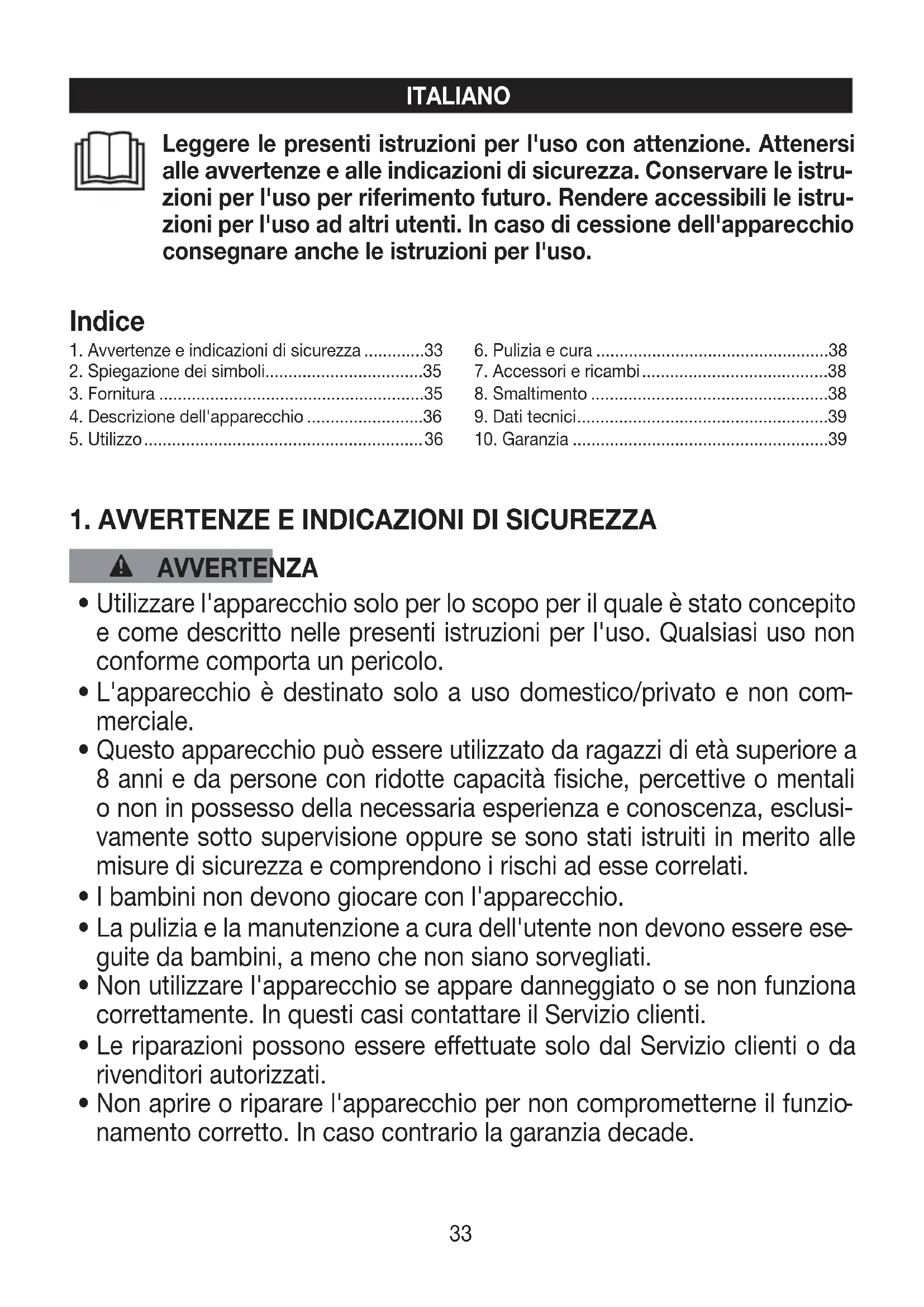 zioni per l'uso per riferimento futuro. Rendere accessibili le istru- zioni per l'uso ad altri utenti. In caso di cessione dell'apparecchio consegnare anche le istruzioni per l'uso. Indice ITALIANO