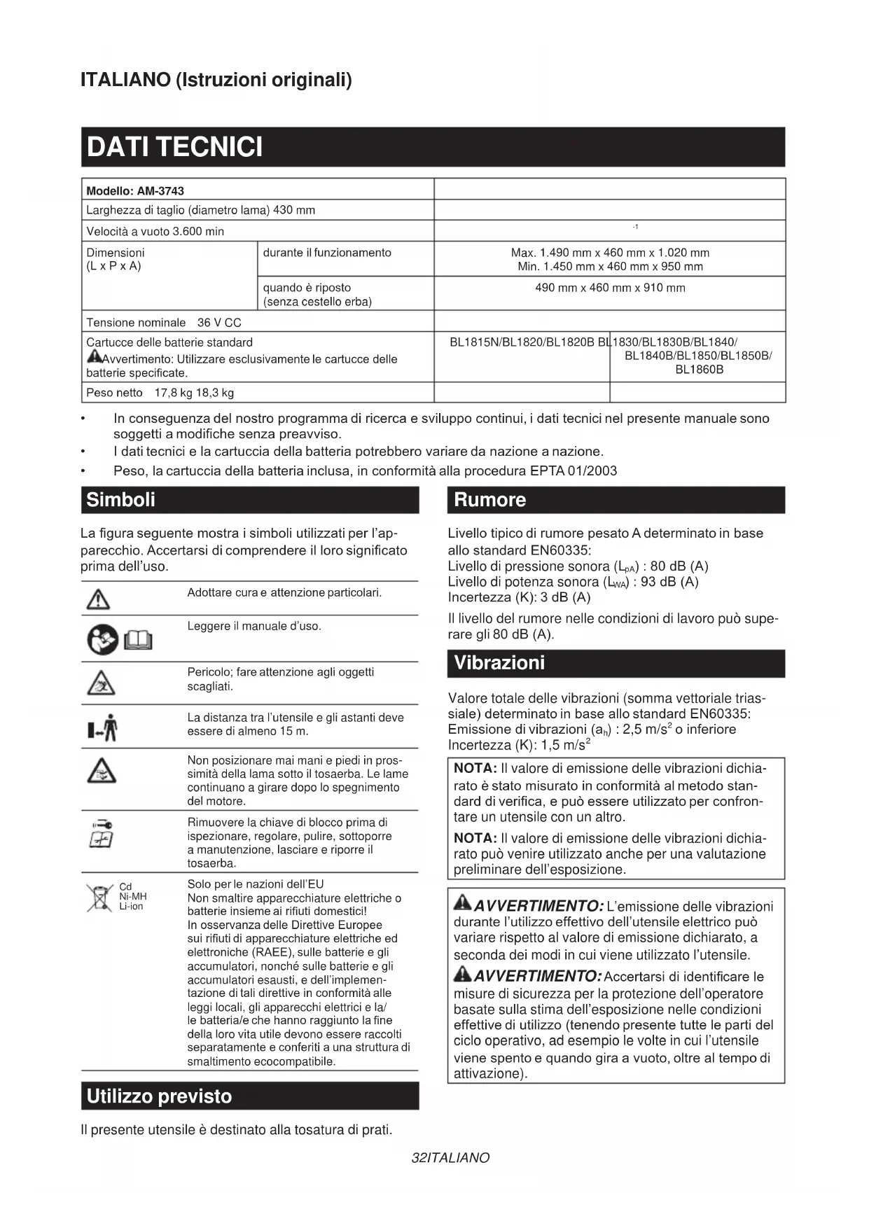 NOTA: Il valore di emissione delle vibrazioni dichia- ratoèstatomisuratoinconformitàalmetodostan- darddiverica,epuòessereutilizzatoperconfron- tare un utensile con un altro. NOTA: Il valore di emissione delle vibrazioni dichia- rato può venire utilizzato anche per una valutazione preliminare dell’esposizione. AVVERTIMENTO: L’emissione delle vibrazioni durantel’utilizzoeffettivodell’utensileelettricopuò variare rispetto al valore di emissione dichiarato, a seconda dei modi in cui viene utilizzato l’utensile. AVVERTIMENTO:Accertarsidiidenticarele misure di sicurezza per la protezione dell’operatore basate sulla stima dell’esposizione nelle condizioni effettivediutilizzo(tenendopresentetuttelepartidel ciclo operativo, ad esempio le volte in cui l’utensile vienespentoequandogiraavuoto,oltrealtempodi attivazione).33 ITALIANO Dichiarazione CE di conformità Modello solo per le nazioni europee Makita dichiara che la/le macchina/e seguente/i: Designazionedellamacchina:Tosaerbaabatteria N.modello/Tipo:AM-3743 ÈconformealleseguentiDirettiveEuropee:2000/14/ EC,2006/42/EC Èstatafabbricatainconformitàallostandardeaidocu- mentistandardizzatiseguenti:EN60335 Illetecnicoinconformitàallanormativa2006/42/CEè disponibile presso: Makita, Jan-Baptist Vinkstraat 2, 3070, Belgio Laproceduradivalutazionedellaconformitàrichiesta dallaDirettiva2000/14/CEèstataeseguitaconforme- mente all’allegato VI. Entenoticato:TÜVRheinlandLGAProductsGmbH AmGrauenStein29,51105Köln,Germania Numerodiidenticazione0197 Livellodipotenzasonoramisurato:93dB(A) Livellodipotenzasonoragarantito:94dB(A)