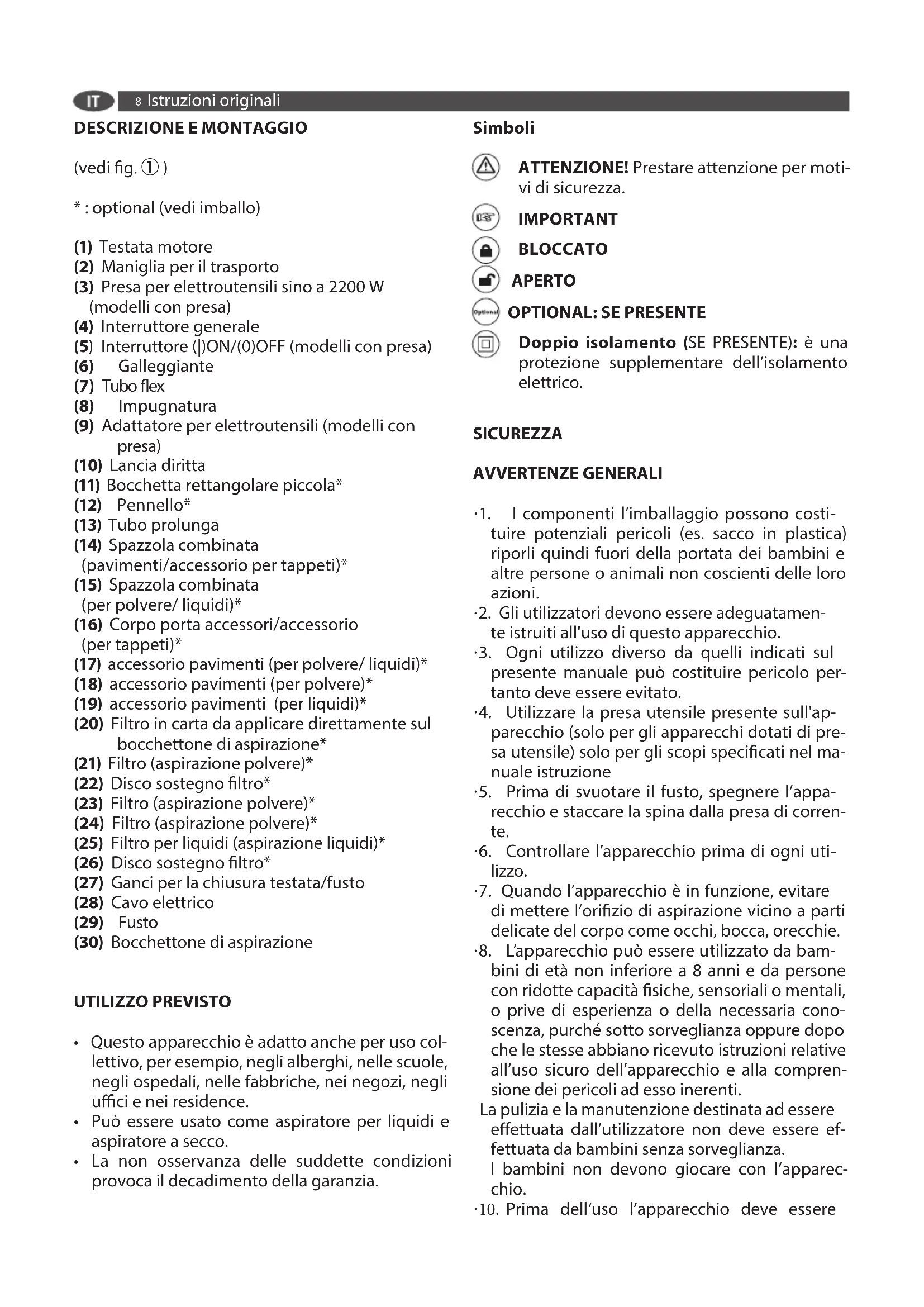 - : optional (vedi imballo) (1) Testata motore (2) Maniglia per il trasporto (3) Presa per elettroutensili sino a 2200 W (modelli con presa) (4) Interruttore generale (5) Interruttore (|)ON/(0)OFF (modelli con presa) (6) Galleggiante (7) Tubo ex (8) Impugnatura (9) Adattatore per elettroutensili (modelli con presa) (10) Lancia diritta (11) Bocchetta rettangolare piccola* (12) Pennello* (13) Tubo prolunga (14) Spazzola combinata (pavimenti/accessorio per tappeti)* (15) Spazzola combinata (per polvere/ liquidi)* (16) Corpo porta accessori/accessorio (per tappeti)* (17) accessorio pavimenti (per polvere/ liquidi)* (18) accessorio pavimenti (per polvere)* (19) accessorio pavimenti (per liquidi)* (20) Filtro in carta da applicare direttamente sul bocchettone di aspirazione* (21) Filtro (aspirazione polvere)* (22) Disco sostegno ltro* (23) Filtro (aspirazione polvere)* (24) Filtro (aspirazione polvere)* (25) Filtro per liquidi (aspirazione liquidi)* (26) Disco sostegno ltro* (27) Ganci per la chiusura testata/fusto (28) Cavo elettrico (29) Fusto (30) Bocchettone di aspirazione UTILIZZO PREVISTO