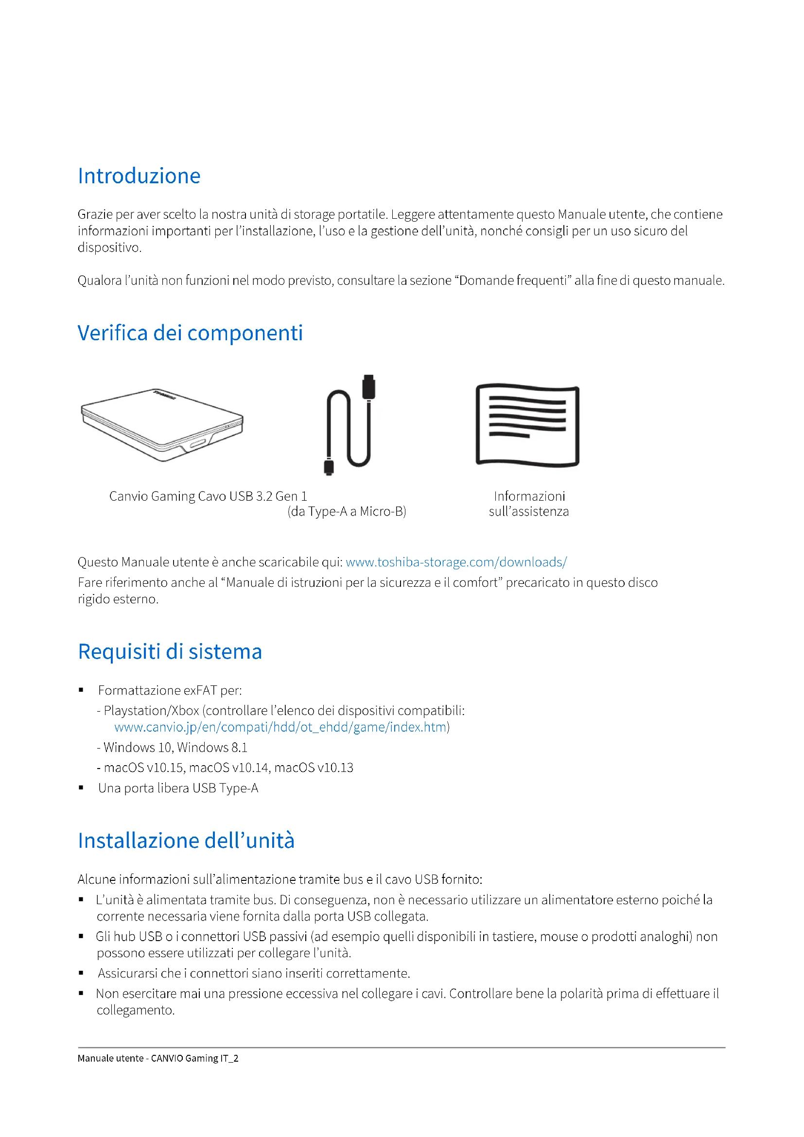 Quando si tenta di formattare l’unità, viene visualizzato il messaggio “Could not complete format” (Impossibile eseguire la formattazione). R: Il problema può essere dovuto a un tentativo di formattare l’unità con il file system FAT. Provare a utilizzare il file system NTFS. Il problema dovrebbe risolversi in questo modo. Servizio di assistenza TOSHIBA Serve aiuto? Visitare la pagina dell’assistenza per dischi rigidi e prodotti per l’archiviazione TOSHIBA all’indirizzo: www.toshiba-storage.com/support Per i reclami durante il periodo di garanzia, vedere: www.toshiba-storage.com/warranty-claims Quando si formatta l’unità, tutti i dati vengono cancellati. NOTAManuale utente - CANVIO Gaming IT_6 Informazioni di conformità Conformità CE Ambiente di lavoro La compatibilità elettromagnetica (CEM) di questo prodotto è stata verificata specificamente per questa categoria di prodotti per ambienti residenziali, commerciali e l’industria leggera. Nessun altro ambiente lavorativo è stato verificato da Toshiba e l’uso di questo prodotto in questi ambienti lavorativi potrebbe essere vietato e non può essere consigliato. Le possibili conseguenze dell’uso del prodotto in ambienti di lavoro non testati potrebbero essere: disturbi di altri prodotti o di questo prodotto nell’area circostante con temporanei malfunzionamenti o perdita/danneggiamento di dati. Esempi di ambienti lavorativi non verificati e suggerimenti relativi: Ambiente industriale (ad es. ambienti in cui viene utilizzata principalmente una tensione trifase di 380 V): pericolo di disturbi di questo prodotto dovuti possibili campi elettromagnetici forti, in particolare vicino a macchinari o unità di alimentazione di grandi dimensioni. Ambiente medico: la compatibilità con la direttiva sui prodotti medici non è stata verificata da Toshiba, pertanto questo prodotto non può essere utilizzato come prodotto medico senza ulteriori verifiche. L’uso in ambienti d’ufficio come negli ospedali non dovrebbe presentare problemi se non vi sono limitazioni imposte dall’amministrazione responsabile. Ambiente automobilistico: consultare le istruzioni del produttore del veicolo per consigli relativi all’uso di questo prodotto (categoria). Velivoli: attenersi alle istruzioni del personale di volo relative alle limitazioni di utilizzo. Ulteriori ambienti non collegati alla compatibilità elettromagnetica Uso all’esterno: come tutte le comuni apparecchiature domestiche o da ufficio, questo prodotto non presenta una particolare resistenza alla penetrazione di umidità e ai forti urti. Atmosfera esplosiva: l’impiego di questo prodotto in ambienti di lavoro così particolari (Ex) non è consentito. Informazioni valide esclusivamente per gli stati dell’Unione Europea: Dichiarazione di conformità REACH Toshiba soddisferà tutti i requisiti REACH (Registration, Evaluation, Authorization and Restriction of Chemicals) ed è impegnata a fornire ai clienti le informazioni relative alle sostanze chimiche contenute nei propri prodotti, conformemente alla normativa REACH. Smaltimento dei prodotti Le informazioni seguenti valgono unicamente per la Turchia: Conforme alla normativa AEEE. Questo prodotto è dotato del marchio CE, in quanto conforme ai requisiti delle direttive UE applicabili. La responsabilità del marchio CE è di competenza di Toshiba Electronics Europe GmbH, Hansaallee 181, 40549 Düsseldorf, Germania. L’uso del simbolo indica l’impossibilità di smaltire questo prodotto come rifiuto domestico. Lo smaltimento corretto di questo prodotto aiuta a prevenire potenziali conseguenze negative per l’ambiente e la salute, che potrebbero scaturire da una gestione non appropriata del prodotto come rifiuto. Per informazioni maggiormente dettagliate sul riciclaggio di questo prodotto, contattare l’ufficio municipale locale preposto, il servizio di smaltimento rifiuti domestici locale o il negozio presso il quale è stato effettuato l’acquisto.Avvisi ©2020 TOSHIBA Electronics Europe GmbH. Tutti i diritti riservati. TOSHIBA si riserva il diritto di apportare modifiche tecniche. TOSHIBA non si assume alcuna responsabilità per danni causati direttamente o indirettamente da errori o omissioni nella documentazione o da discrepanze tra il prodotto e la documentazione. Il nome Toshiba e i relativi loghi sono marchi registrati di Toshiba. macOS è un marchio di Apple Inc. Gli altri nomi di aziende, prodotti e servizi sono marchi commerciali delle rispettive aziende titolari. Le caratteristiche tecniche, le configurazioni, i colori, i componenti e l’assistenza del prodotto sono soggetti a modifiche senza preavviso. Un gigabyte (GB) corrisponde a un miliardo di byte e un terabyte (TB) corrisponde a mille miliardi di byte. La capacità totale disponibile varia a seconda dell’ambiente operativo, perciò i risultati ottenuti e la capacità di archiviazione varieranno di conseguenza. Per il sistema operativo del computer, tuttavia, lo spazio di memoria è indicato usando potenze di 2 per definire 1 TB = 2