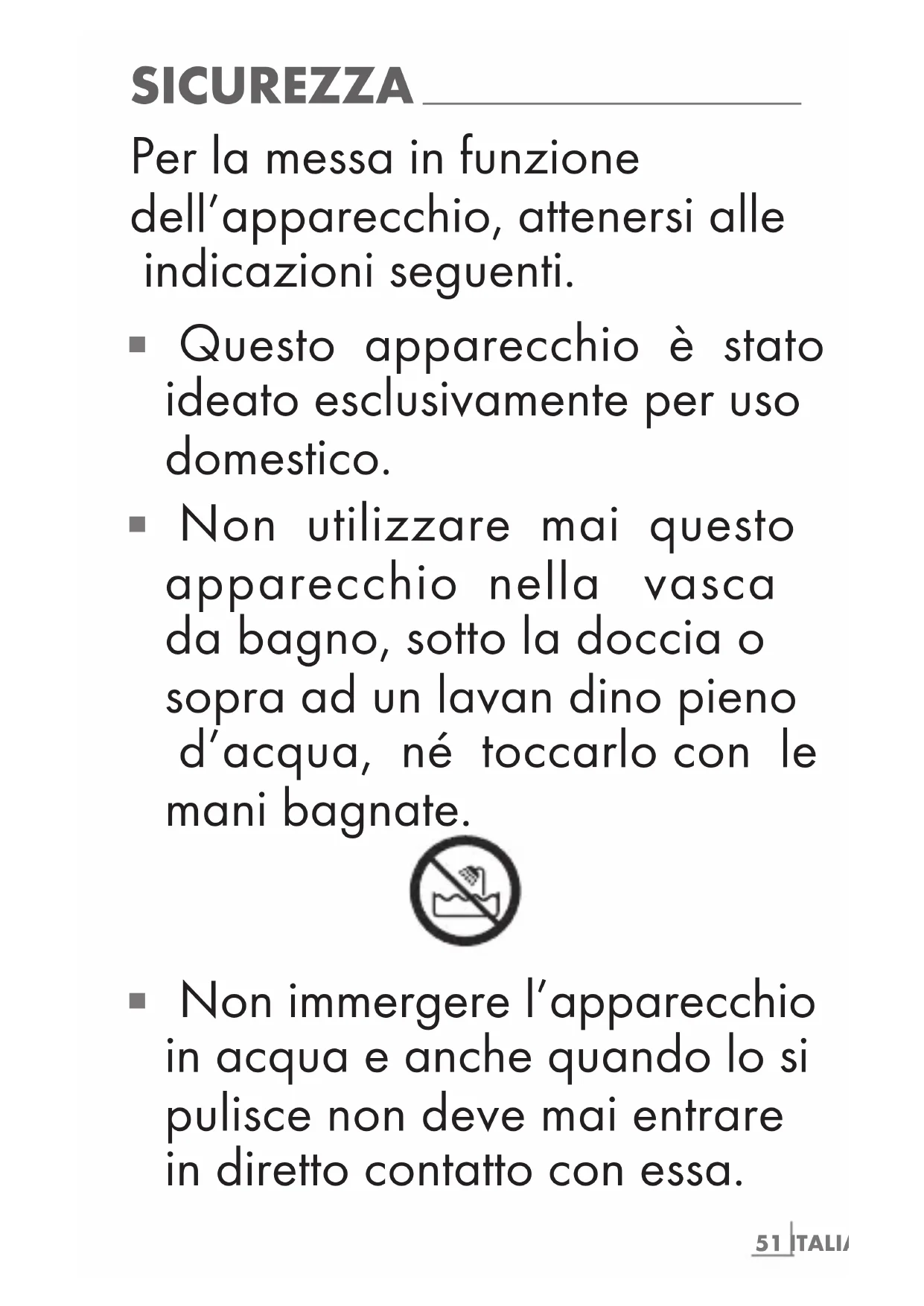Non immergere l’apparecchio in acqua e anche quando lo si pulisce non deve mai entrare in diretto contatto con essa.52 ITALIANO