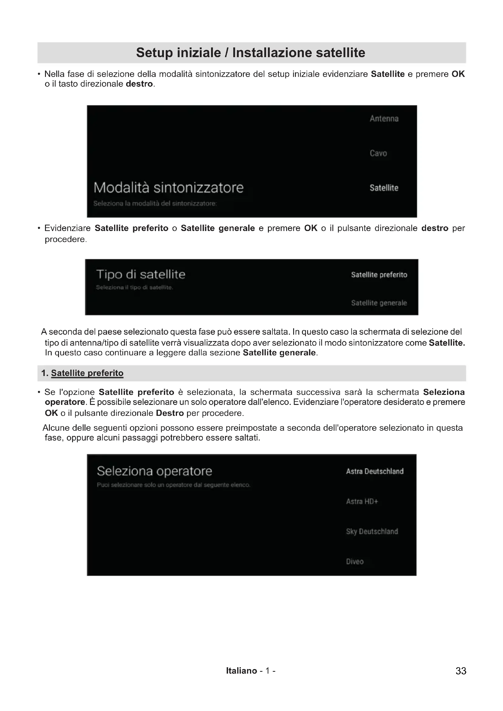 - Se l'opzione Satellite preferito è selezionata, la schermata successiva sarà la schermata Seleziona operatore. È possibile selezionare un solo operatore dall'elenco. Evidenziare l'operatore desiderato e premere OK o il pulsante direzionale Destro per procedere. Alcune delle seguenti opzioni possono essere preimpostate a seconda dell'operatore selezionato in questa fase, oppure alcuni passaggi potrebbero essere saltati. 33Italiano - 2 - 1.1. Tipo di antenna - diretta