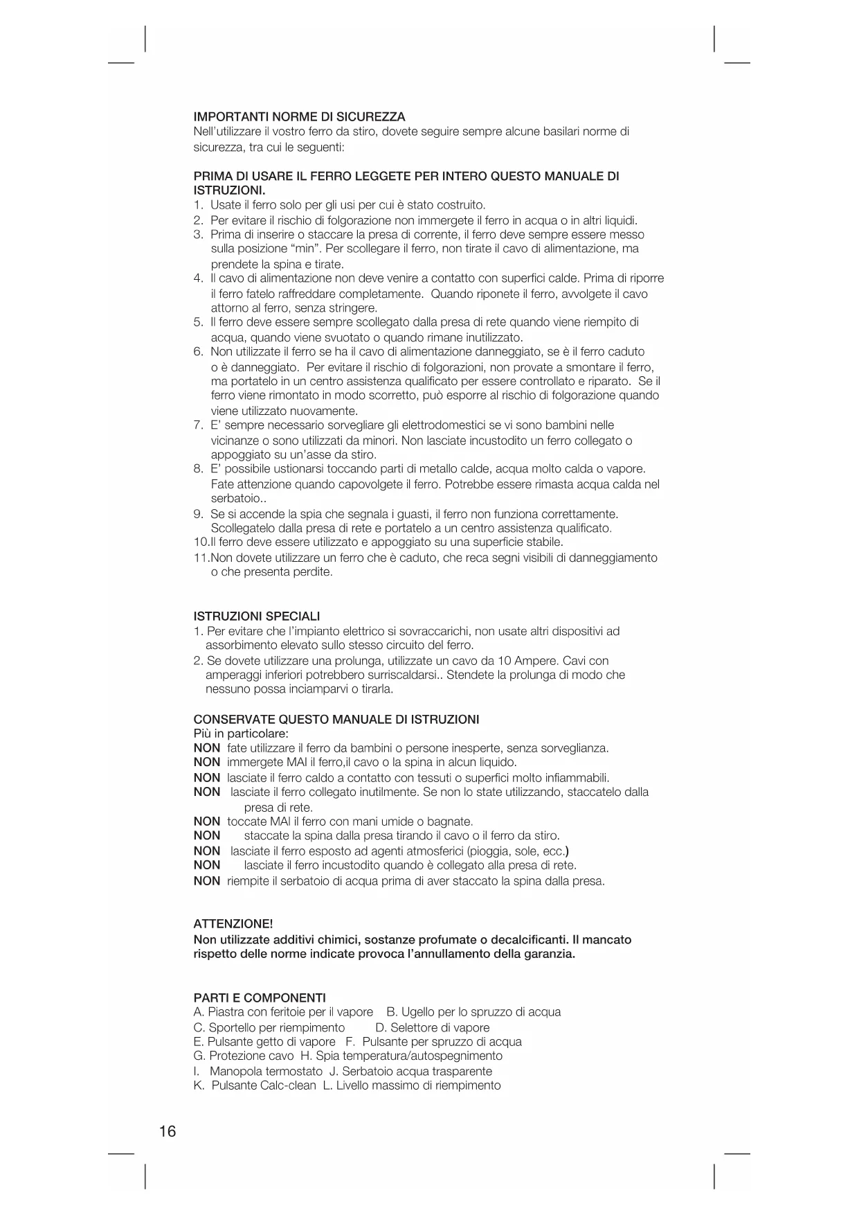 Nell’utilizzare il vostro ferro da stiro, dovete seguire sempre alcune basilari norme di sicurezza, tra cui le seguenti: PRIMA DI USARE IL FERRO LEGGETE PER INTERO QUESTO MANUALE DI ISTRUZIONI.