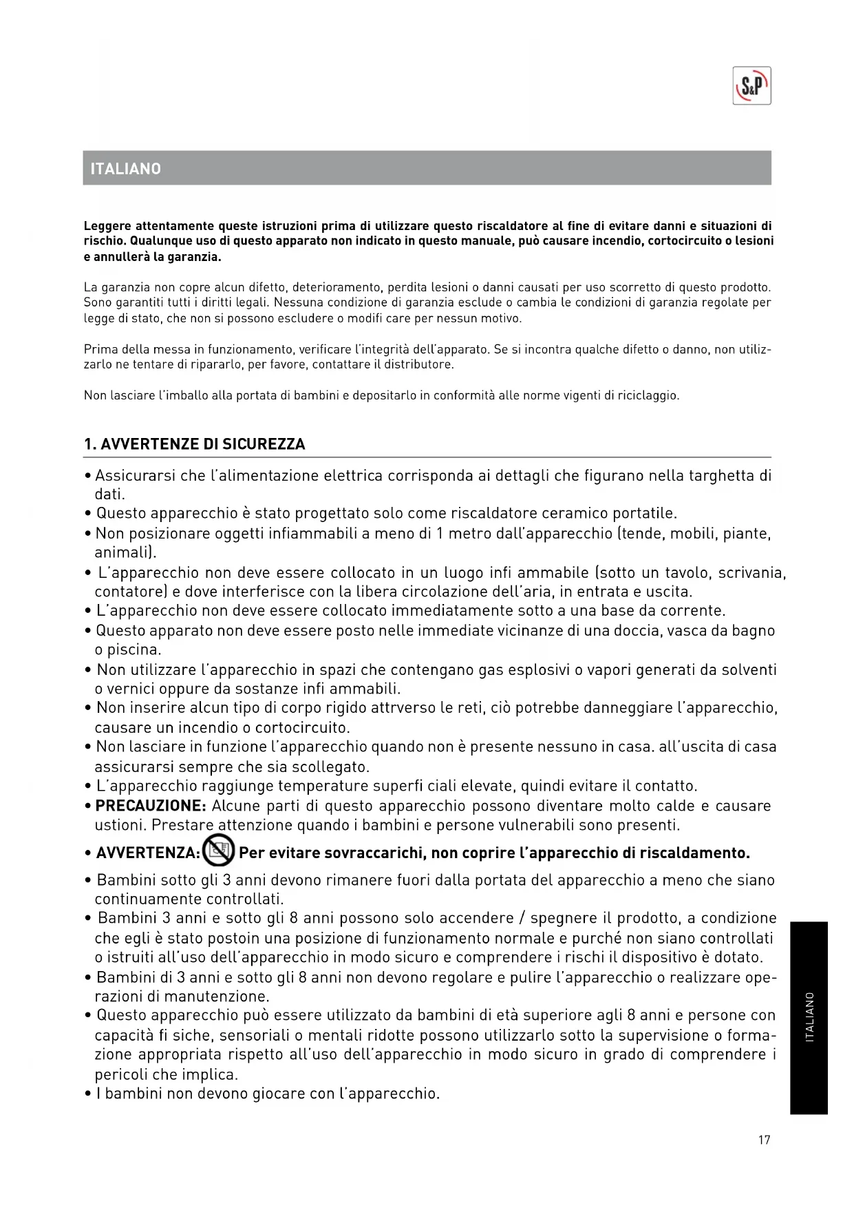 - Para todas as perguntas sobre os produtos da S&P, por favor entre em contato com o Serviço de Pós-Vendas da rede se em território espanhol, ou o seu representante no mundo. Para a localização, pode visitar o nosso site em www.solerpalau.com O FABRICANTE NÃO SE RESPONSABILIZA POR DANOS A PESSOAS E / OU MATERIAIS RESULTANTES DE QUEBRA DESSES AVISOS. S&P RESERVA-SE O DIREITO DE ALTERAR PRODUTOS SEM PRÉVIO AVISO.17 ITALIANO ITALIANO Leggere attentamente queste istruzioni prima di utilizzare questo riscaldatore al fi ne di evitare danni e situazioni di rischio. Qualunque uso di questo apparato non indicato in questo manuale, può causare incendio, cortocircuito o lesioni e annullerà la garanzia. La garanzia non copre alcun difetto, deterioramento, perdita lesioni o danni causati per uso scorretto di questo prodotto. Sono garantiti tutti i diritti legali. Nessuna condizione di garanzia esclude o cambia le condizioni di garanzia regolate per legge di stato, che non si possono escludere o modifi care per nessun motivo. Prima della messa in funzionamento, verifi care l’integrità dell’apparato. Se si incontra qualche difetto o danno, non utiliz- zarlo ne tentare di ripararlo, per favore, contattare il distributore. Non lasciare l’imballo alla portata di bambini e depositarlo in conformità alle norme vigenti di riciclaggio.