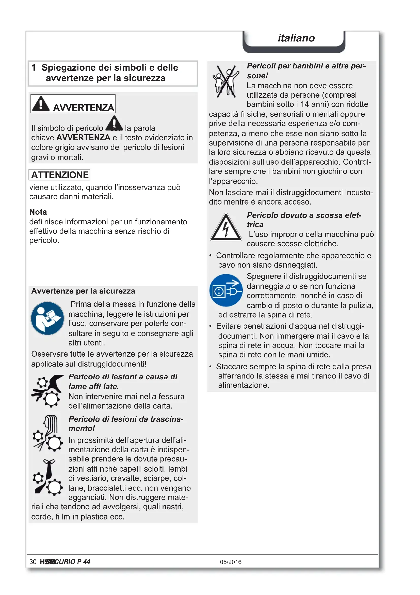 - Nombre de feuilles max. (format A4, 70 g/m² ou 80 g/m²), introduites en longueur, qui sont déchiquetées en un passage. La mesure des données de rendement s‘effectue avec un bloc de coupe neuf, huilé et moteur à froid. Une tension inférieure du secteur ou une autre fréquence du secteur que celles indiquées peuvent entraîner une diminution de la puissance de coupe et une augmentation du bruit pendant le fonctionnement. Selon la structure et les propriétés du papier et selon la manière d‘introduire les feuilles, la puissance peut varier.30 SECURIO P 44 05/2016 italiano 1 Spiegazione dei simboli e delle avvertenze per la sicurezza Nota defi nisce informazioni per un funzionamento effettivo della macchina senza rischio di pericolo. AVVERTENZA Il simbolo di pericolo con la parola chiave AVVERTENZA e il testo evidenziato in colore grigio avvisano del pericolo di lesioni gravi o mortali. Avvertenze per la sicurezza Prima della messa in funzione della macchina, leggere le istruzioni per l’uso, conservare per poterle con- sultare in seguito e consegnare agli altri utenti. Osservare tutte le avvertenze per la sicurezza applicate sul distruggidocumenti! Pericolo di lesioni a causa di lame affi late. Non intervenire mai nella fessura dell’alimentazione della carta. Pericolo di lesioni da trascina- mento! In prossimità dell’apertura dell’ali- mentazione della carta è indispen- sabile prendere le dovute precau- zioni affi nché capelli sciolti, lembi di vestiario, cravatte, sciarpe, col- lane, braccialetti ecc. non vengano agganciati. Non distruggere mate- riali che tendono ad avvolgersi, quali nastri, corde, fi lm in plastica ecc. Pericoli per bambini e altre per- sone! La macchina non deve essere utilizzata da persone (compresi bambini sotto i 14 anni) con ridotte capacità fi siche, sensoriali o mentali oppure prive della necessaria esperienza e/o com- petenza, a meno che esse non siano sotto la supervisione di una persona responsabile per la loro sicurezza o abbiano ricevuto da questa disposizioni sull’uso dell’apparecchio. Control- lare sempre che i bambini non giochino con l’apparecchio. Non lasciare mai il distruggidocumenti incusto- dito mentre è ancora acceso. Pericolo dovuto a scossa elet- trica L’uso improprio della macchina può causare scosse elettriche.