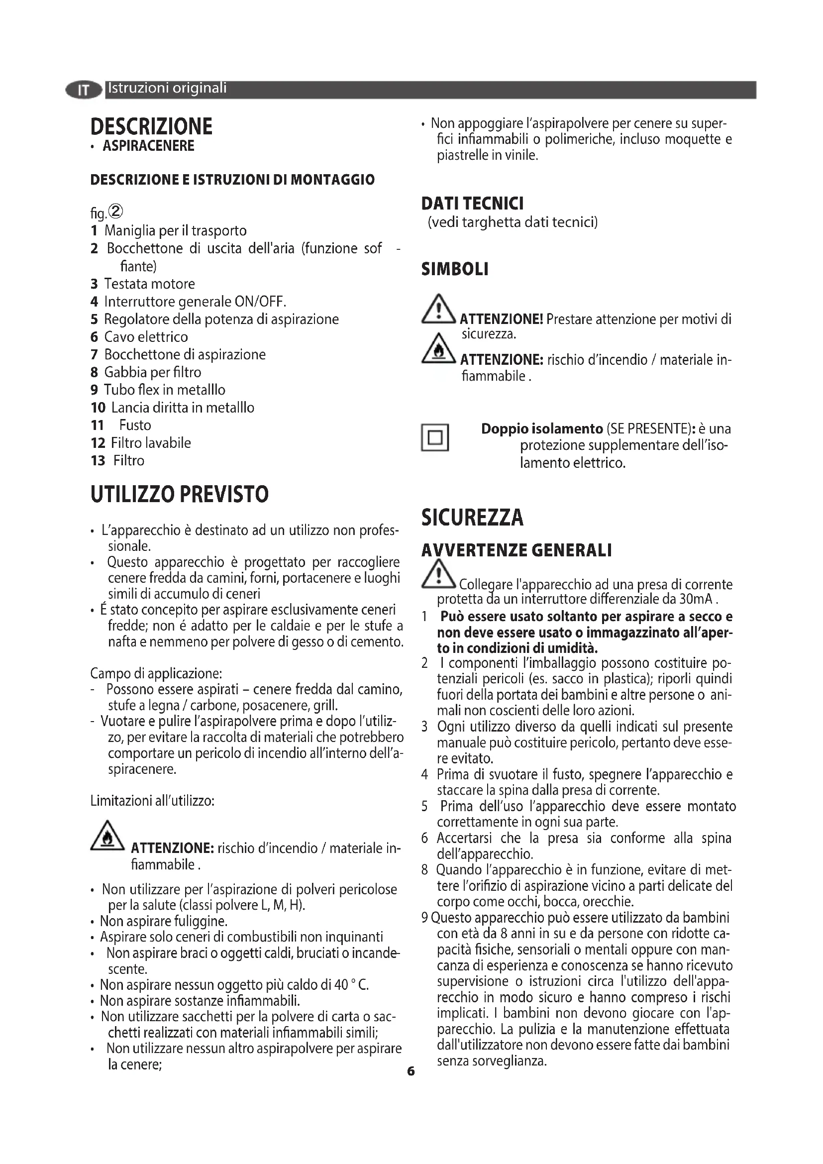 5• Non appoggiare l’aspirapolvere per cenere su super- ci inammabili o polimeriche, incluso moquette e piastrelle in vinile. DATI TECNICI (vedi targhetta dati tecnici) SIMBOLI ATTENZIONE! Prestare attenzione per motivi di sicurezza. ATTENZIONE: rischio d’incendio / materiale in- ammabile . Doppio isolamento (SE PRESENTE): è una protezione supplementare dell’iso