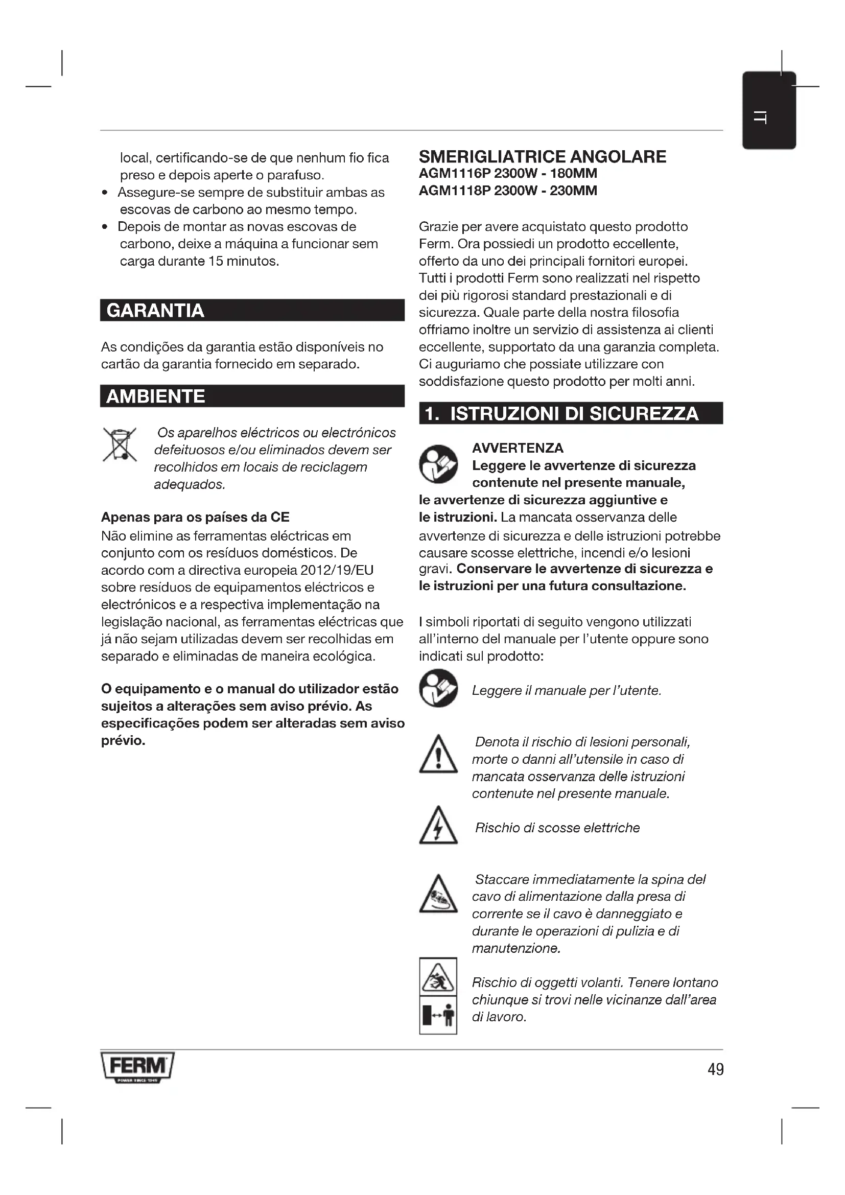 - Dopo aver montato le nuove spazzole in carbonio lasciare funzionare l’elettroutensile a vuoto per 15 minuti. GARANZIA Le condizioni della garanzia possono essere consultate sul foglio di garanzia separato allegato al presente manuale. RISPETTO AMBIENTALE Le apparecchiature elettriche o elettroniche difettose e/o scartate devono essere raccolte presso gli opportuni siti di riciclaggio. Solo per i Paesi CE Non smaltire gli elettroutensili insieme ai rifiuti domestici. Secondo la Direttiva europea 2002/96/ EC sui rifiuti delle apparecchiature elettriche ed elettroniche e relativa implementazione nelle normative locali, gli elettroutensili ormai inutilizzabili devono essere raccolti separatamente e smaltiti in modo ecologico. Il prodotto e il manuale per l’utente sono soggetti a modifiche. I dati tecnici possono essere modificati senza ulteriore notifica.57