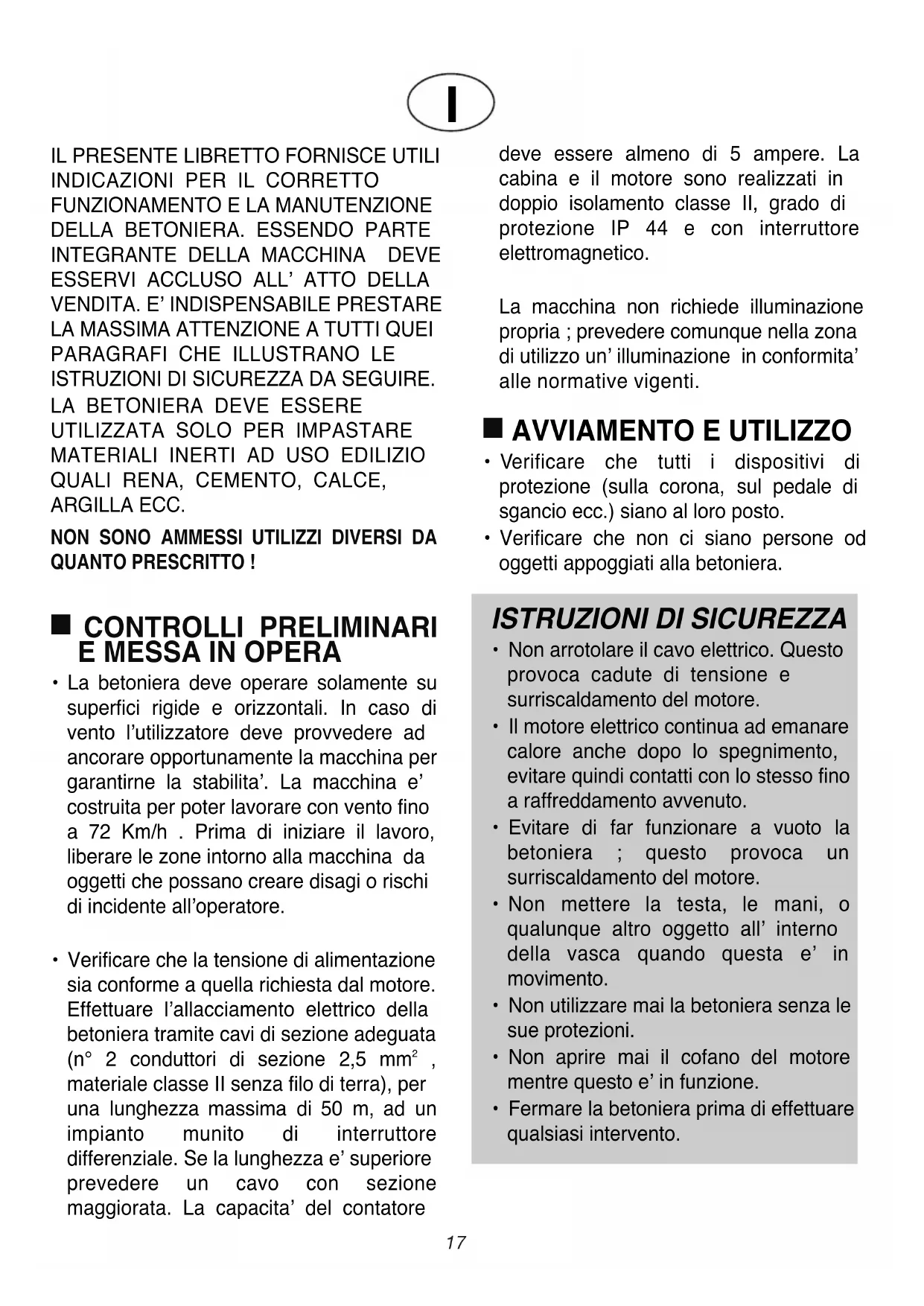 - Non utilizzare la betoniera in ambienti con atmosfera esplosiva. Disinnestare l'allaciamento elettrico prima di aprire la cabina. L'aparecchio deve essere utilizzato solamente quando tutte le protezioni sono a posto. Attenzione ! L'aparecchio doppiamente isolato. La classe II sta preservata solamente a condizione che, durante i riparazioni, sìano utilizate pezzi d'origine e che le distanze di isolamento non sìano modificate.