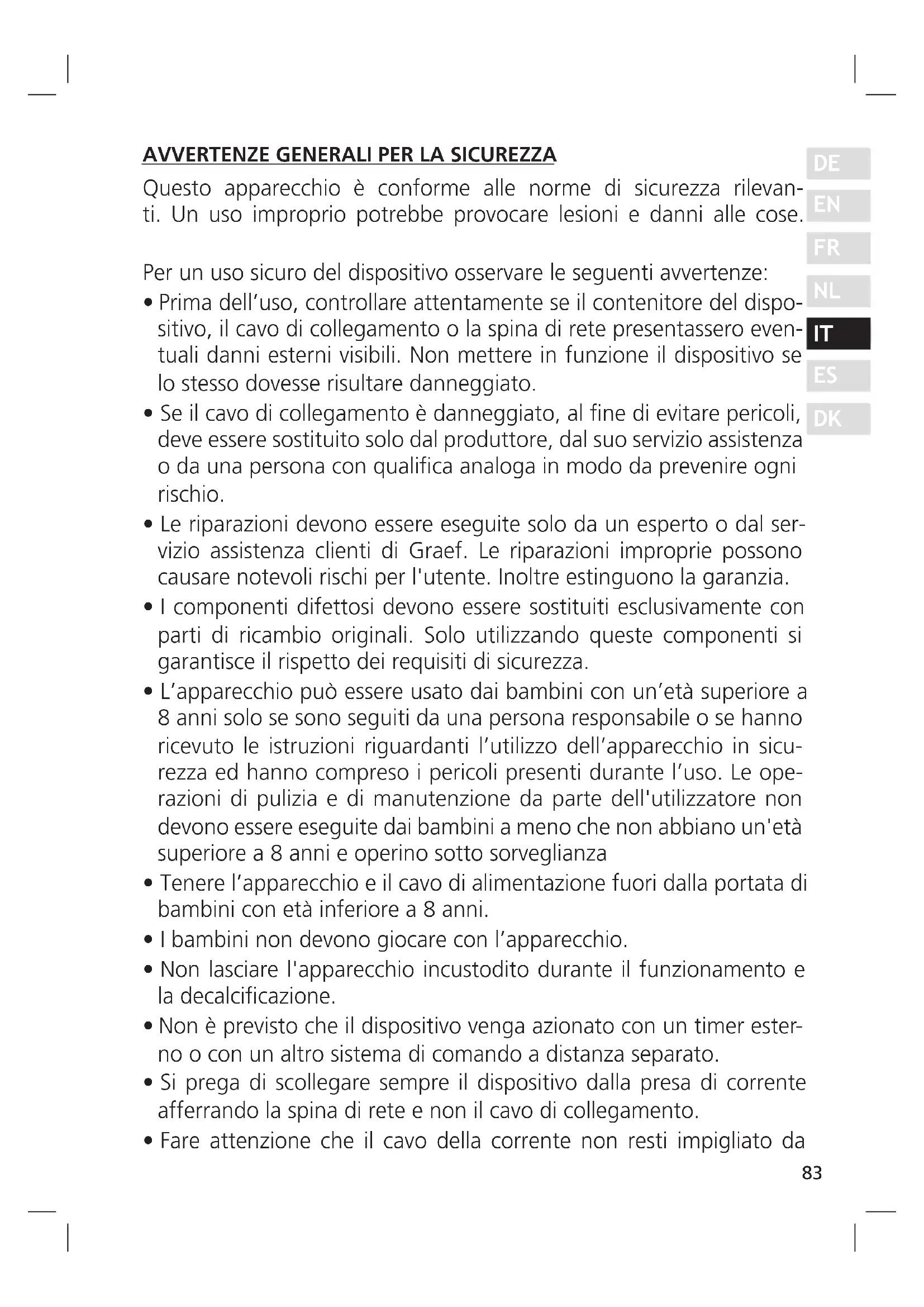 A partire dalla data di cessione, per questo prodotto offriamo 24 mesi di garanzia per difetti riconducibili a errori di processo di realizzazione oppure a difetti materiali. I vostri diritti di garanzia legali previsti al § 437 e segg. BGB non vengono toccati da questa norma. La prestazione di garanzia non contempla i danni derivanti da uso o trattamento impropri, e difetti che inuiscono sul funzionamento o il valore dell'apparecchio solo in misura esigua. Oltre a ciò, non ci assumiamo alcuna responsabilità per danni riconducibili ad una mancata o una insufciente decalcicazione o cura del dispo- sitivo. Anche in questo caso la garanzia decade. Utilizzare esclusivamente pastiglie decalcicanti e depurative originali Graef. Inoltre sono esclusi dalla garanzia danni riconducibili al trasporto, qualora questo non sia sotto alla nostra responsabilità. Per danni derivanti da una riparazione non eseguita da noi o dai nostri rappre- sentanti, è escluso il diritto di garanzia. In caso di reclamo legittimo effettueremo a nostra scelta la riparazione del prodotto difettoso o la sua sostituzione con un prodotto esente da difetti. ACCESSORI Si possono ordinare gli accessori nel nostro negozio online www.graef.de oppure tramite un rivenditore specializzato. Inoltre sul nostro Online-Shop potrete trovare tantissimi tipi di caffè diversi.103