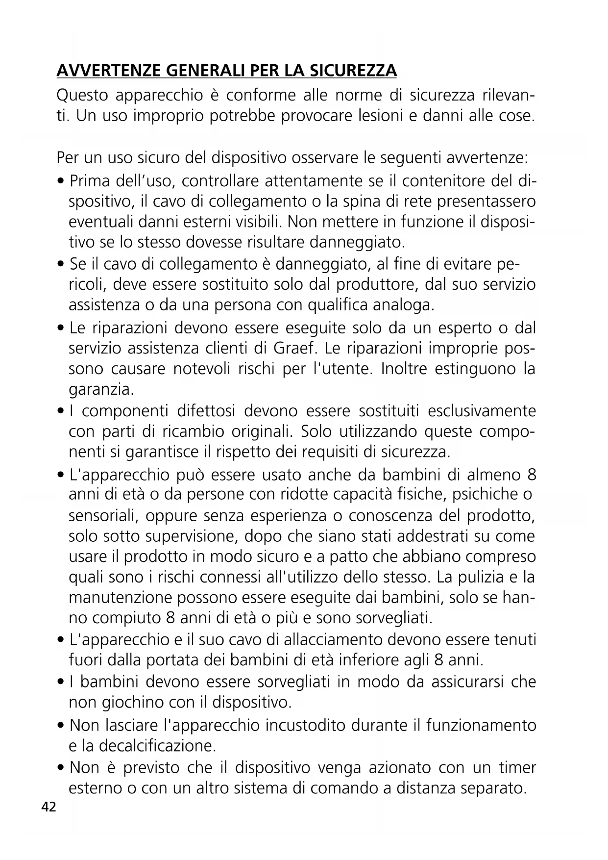 - Le riparazioni devono essere eseguite solo da un esperto o dal servizio assistenza clienti di Graef. Le riparazioni improprie pos- sono causare notevoli rischi per l'utente. Inoltre estinguono la garanzia.