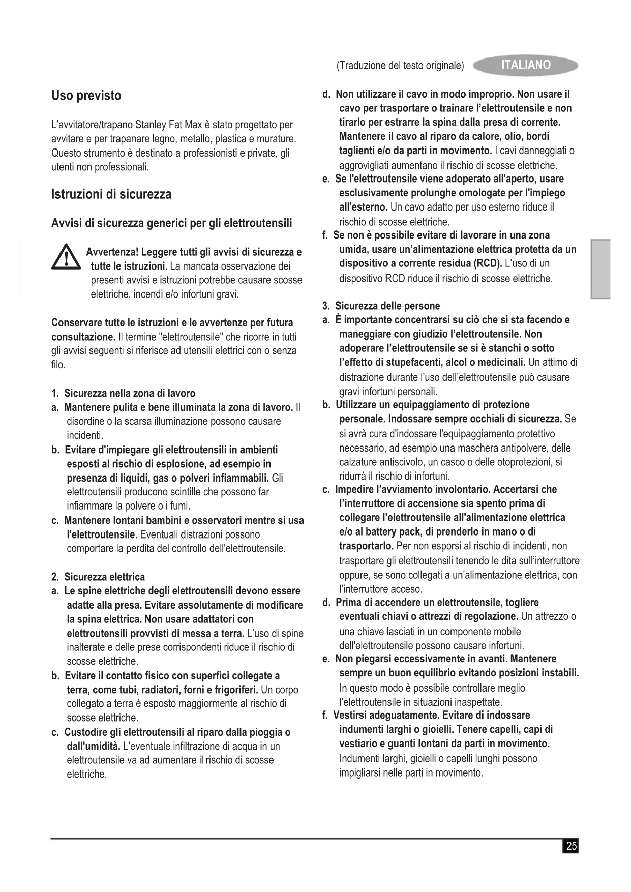 Leggere il presente manuale d'uso prima dell'impiego.28 (Traduzione del testo originale) ITALIANO Sicurezza elettrica