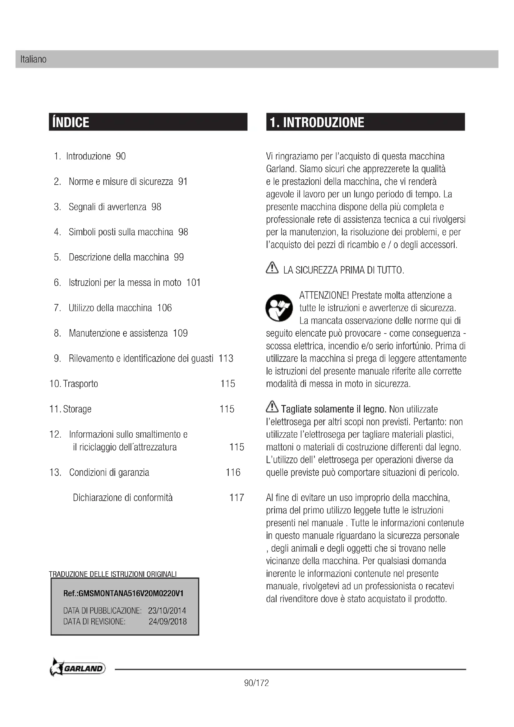 Dichiarazione di conformità 117 Vi ringraziamo per l’acquisto di questa macchina Garland. Siamo sicuri che apprezzerete la qualità e le prestazioni della macchina, che vi renderà agevole il lavoro per un lungo periodo di tempo. La presente macchina dispone della più completa e professionale rete di assistenza tecnica a cui rivolgersi per la manutenzion, la risoluzione dei problemi, e per l’acquisto dei pezzi di ricambio e / o degli accessori. LA SICUREZZA PRIMA DI TUTTO. ATTENZIONE! Prestate molta attenzione a tutte le istruzioni e avvertenze di sicurezza. La mancata osservazione delle norme qui di seguito elencate può provocare - come conseguenza - scossa elettrica, incendio e/o serio infortúnio. Prima di utilizzare la macchina si prega di leggere attentamente le istruzioni del presente manuale riferite alle corrette modalità di messa in moto in sicurezza. Tagliate solamente il legno. Non utilizzate l’elettrosega per altri scopi non previsti. Pertanto: non utilizzate l’elettrosega per tagliare materiali plastici, mattoni o materiali di costruzione differenti dal legno. L’utilizzo dell’ elettrosega per operazioni diverse da quelle previste può comportare situazioni di pericolo. Al fine di evitare un uso improprio della macchina, prima del primo utilizzo leggete tutte le istruzioni presenti nel manuale . Tutte le informazioni contenute in questo manuale riguardano la sicurezza personale , degli animali e degli oggetti che si trovano nelle vicinanze della macchina. Per qualsiasi domanda inerente le informazioni contenute nel presente manuale, rivolgetevi ad un professionista o recatevi dal rivenditore dove è stato acquistato il prodotto. ÍNDICE 1. INTRODUZIONE Ref.:GMSMONTANA516V20M0220V1