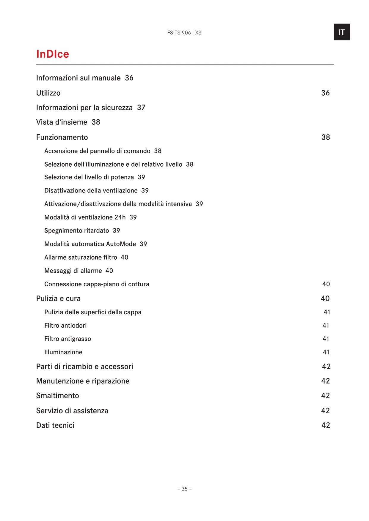 indice Informazioni sul manuale 36 Utilizzo 36 Informazioni per la sicurezza 37 Vista d‘insieme 38 Funzionamento 38 Accensione del pannello di comando 38 Selezione dell‘illuminazione e del relativo livello 38 Selezione del livello di potenza 39 Disattivazione della ventilazione 39 Attivazione/disattivazione della modalità intensiva 39 Modalità di ventilazione 24h 39 Spegnimento ritardato 39 Modalità automatica AutoMode 39 Allarme saturazione filtro 40 Messaggi di allarme 40 Connessione cappa-piano di cottura 40 Pulizia e cura 40 Pulizia delle superfici della cappa 41 Filtro antiodori 41 Filtro antigrasso 41 Illuminazione 41 Parti di ricambio e accessori 42 Manutenzione e riparazione 42 Smaltimento 42 Servizio di assistenza 42 Dati tecnici 42FS TS 906 I XS – 36 –