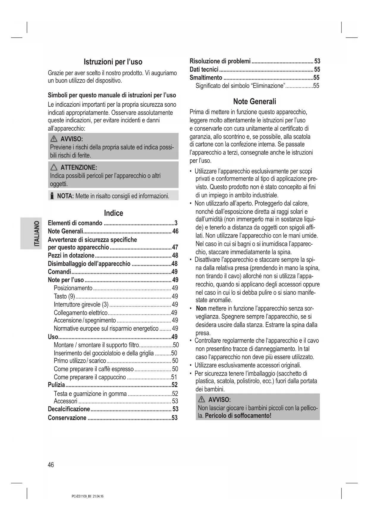 - Per sicurezza tenere l’imballaggio (sacchetto di plastica, scatola, polistirolo, ecc.) fuori dalla portata dei bambini. AVVISO: Non lasciar giocare i bambini piccoli con la pellico- la. Pericolo di soffocamento!47 PC-ES1109_IM 21.04.16 Avvertenze di sicurezza speciche per questo apparecchio AVVISO: Rischio di scottature! La testa, il supporto ltro, l’ugello vapore e il vassoio tazze diventano molto calde durante il funzionamento.