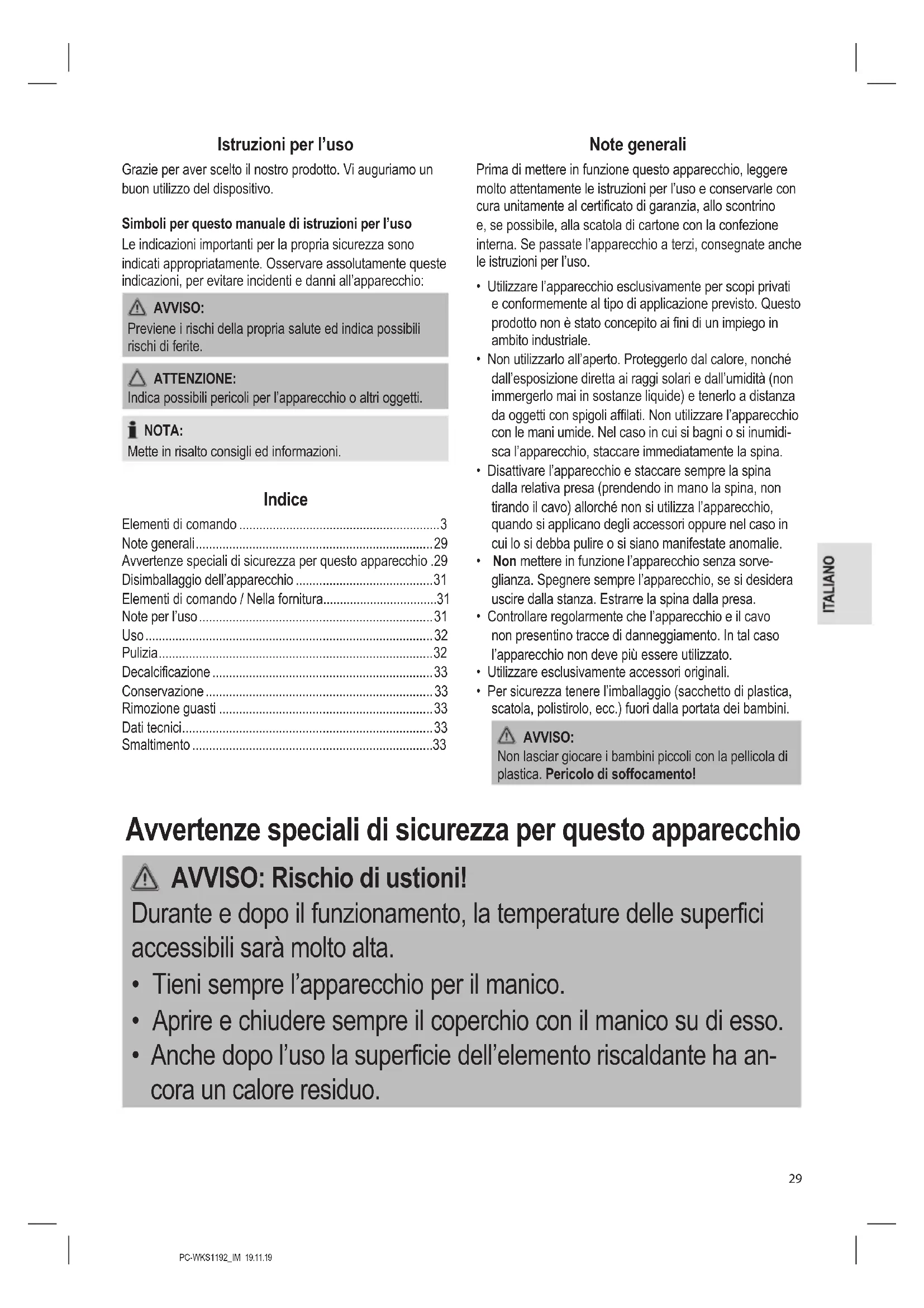 - Gli apparecchi possono essere utilizzato da persone con ridotte capacità fisiche, sensoriali o mentali e mancanza di esperienza e conoscenza sotto la supervisione o grazie alle istruzioni sull’uso dell’apparecchio in modo sicuro e quando essi capiscono i peri- coli potenziali derivanti dall’utilizzo dell’apparecchio.PC-WKS1192_IM 19.11.19