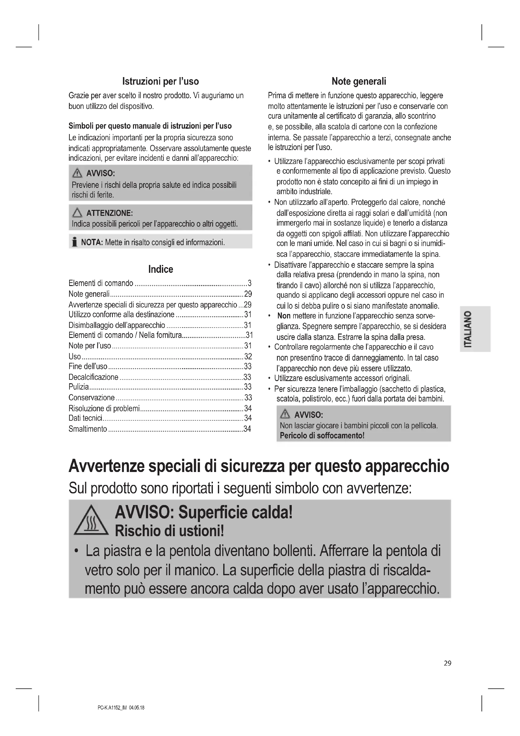 - La piastra e la pentola diventano bollenti. Afferrare la pentola di vetro solo per il manico. La superficie della piastra di riscalda- mento può essere ancora calda dopo aver usato l’apparecchio.PC-K A1152_IM 04.05.18