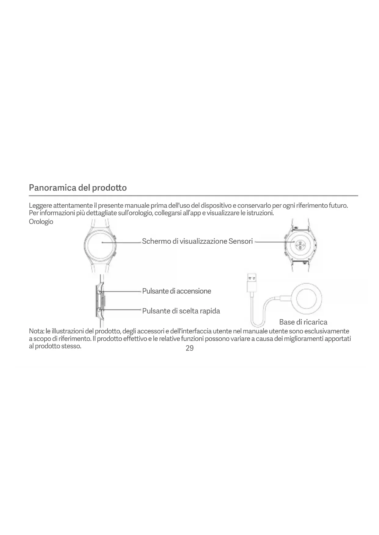 Per l'uso quotidiano, stringere comodamente l'orologio aorno al polso a circa un dito di distanza dall'osso del polso. Regolare il cinturino in modo da consentire al sensore della frequenza cardiaca di raccogliere i dati correamente. Tenere il polso fermo durante la misurazione della frequenza cardiaca con l'orologio. L'orologio ha una classificazione di impermeabilità di 5 ATM (50 metri di profondità). Può essere indossato in piscina, per nuotare vicino alla riva o per le aività in acque poco profonde. Tuavia, non può essere usato soo la doccia calda, in sauna o durante le immersioni subacquee. Inoltre, evitare di esporre l'orologio all'impao direo con correnti repentine durante gli sport acquatici. L'impermeabilità non è permanente e potrebbe diminuire con il tempo. Il touchscreen dell'orologio non funziona mentre si è so'acqua. Se l'orologio entra in contao con l'acqua, utilizzare un panno morbido per eliminare l'acqua in eccesso dalla superficie prima di riutilizzarlo. Durante l'uso quotidiano, non stringere troppo l'orologio. Mantenere asciua la zona direamente a contao con la pelle e pulire regolarmente il cinturino con acqua. In caso di rossore o gonfiore nella zona a contao con il dispositivo, interrompere immediatamente l'uso dell'orologio e rivolgersi a un medico. Le informazioni sul prodoo sono riportate sul fondello dell’orologio per riferimento. Utilizzare la base di ricarica in dotazione per ricaricare l’orologio. Utilizzare esclusivamente alimentatori conformi agli standard di sicurezza locali o certificati e forniti da produori qualificati.
