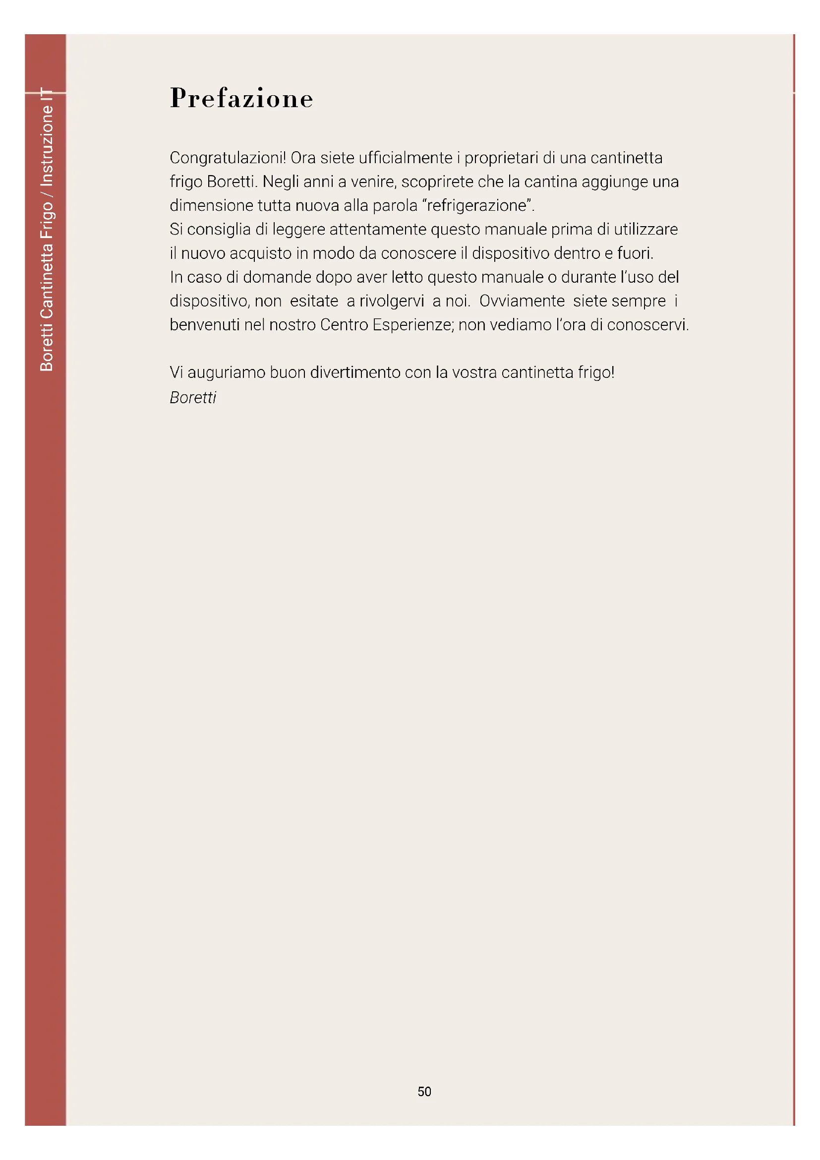 Disposal of old appliances Boretti Wine Cabinets / Instructions EN49 Boretti Wine Cabinets / Instructions ENCongratulazioni! Ora siete ufcialmente i proprietari di una cantinetta frigo Boretti. Negli anni a venire, scoprirete che la cantina aggiunge una dimensione tutta nuova alla parola “refrigerazione”. Si consiglia di leggere attentamente questo manuale prima di utilizzare il nuovo acquisto in modo da conoscere il dispositivo dentro e fuori. In caso di domande dopo aver letto questo manuale o durante l’uso del dispositivo, non esitate a rivolgervi a noi. Ovviamente siete sempre i benvenuti nel nostro Centro Esperienze; non vediamo l’ora di conoscervi. Vi auguriamo buon divertimento con la vostra cantinetta frigo! Boretti