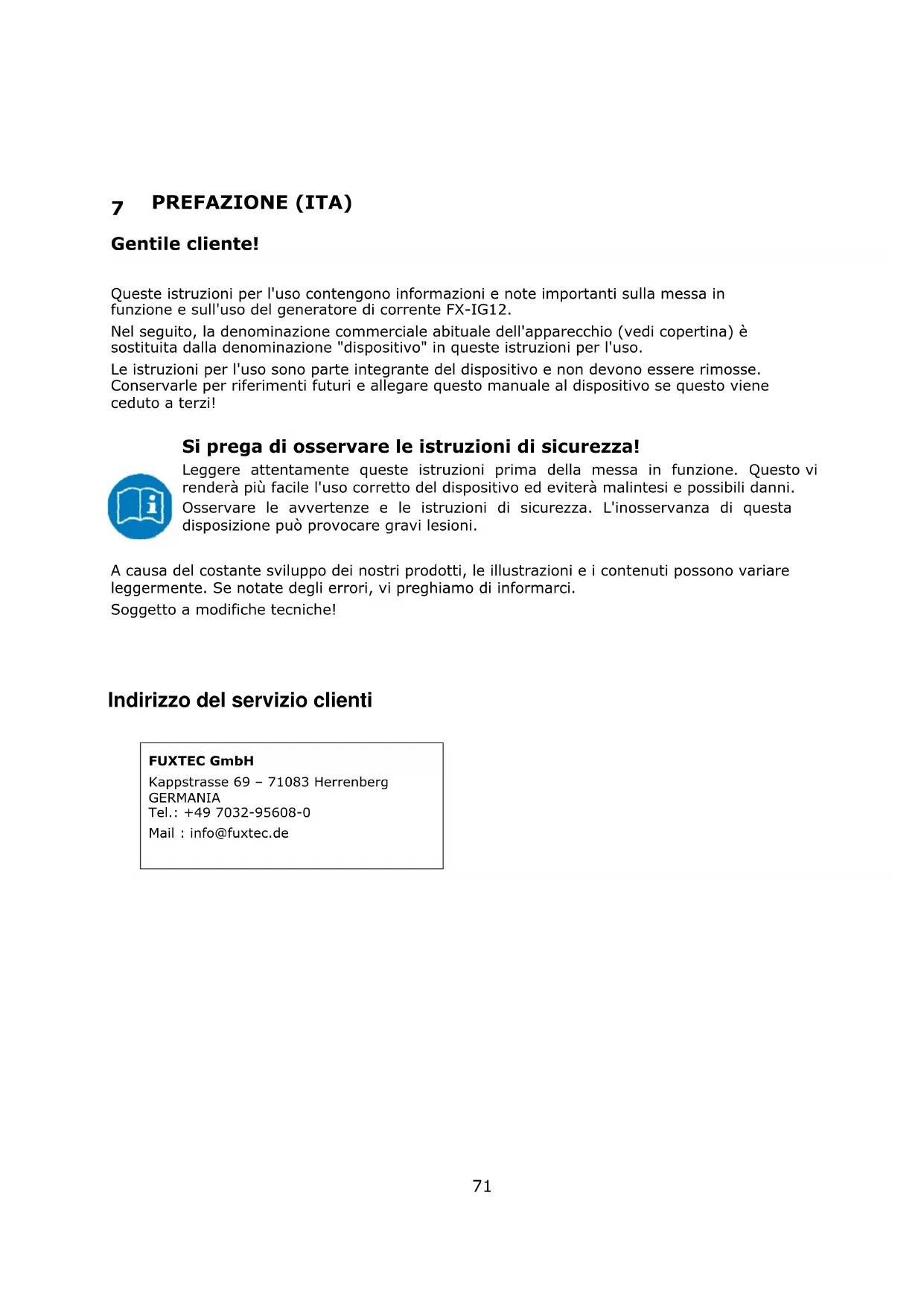 PREFAZIONE (ITA) Gentile cliente! Queste istruzioni per l'uso contengono informazioni e note importanti sulla messa in funzione e sull'uso del generatore di corrente FX-IG12. Nel seguito, la denominazione commerciale abituale dell'apparecchio (vedi copertina) è sostituita dalla denominazione "dispositivo" in queste istruzioni per l'uso. Le istruzioni per l'uso sono parte integrante del dispositivo e non devono essere rimosse. Conservarle per riferimenti futuri e allegare questo manuale al dispositivo se questo viene ceduto a terzi! Si prega di osservare le istruzioni di sicurezza! Leggere attentamente queste istruzioni prima della messa in funzione. Questo vi renderà più facile l'uso corretto del dispositivo ed eviterà malintesi e possibili danni. Osservare le avvertenze e le istruzioni di sicurezza. L'inosservanza di questa disposizione può provocare gravi lesioni. A causa del costante sviluppo dei nostri prodotti, le illustrazioni e i contenuti possono variare leggermente. Se notate degli errori, vi preghiamo di informarci. Soggetto a modifiche tecniche!