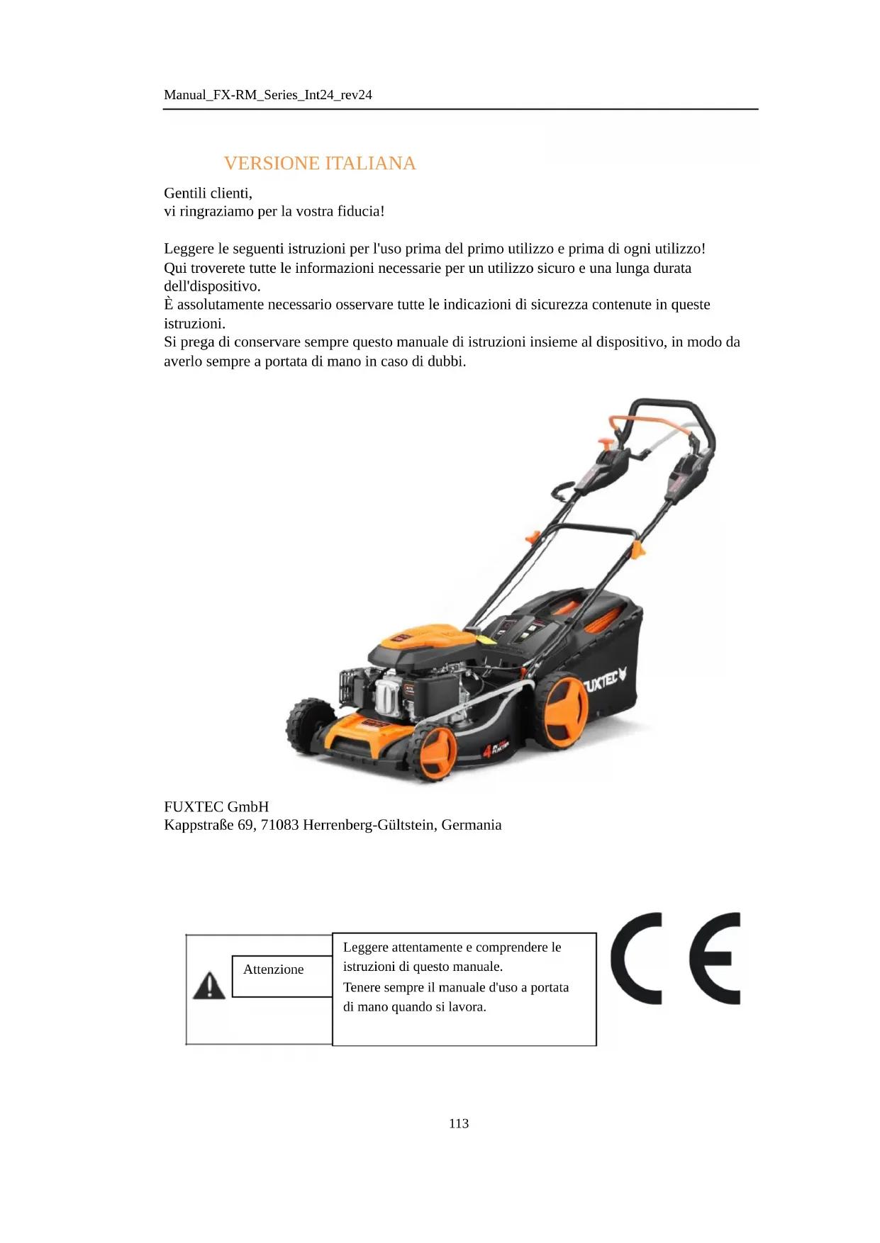 Istruzioni di sicurezza Non utilizzare il dispositivo in uno spazio chiuso dove può accumularsi del pericoloso monossido di carbonio. Tosare solo alla luce del giorno o sotto una buona luce artificiale. Se possibile, evitare di utilizzare il dispositivo in condizioni di umidità. Assicuratevi di avere una posizione stabile sulle piste. Non correre mai con il dispositivo, ma camminare. Tosare sempre trasversalmente al tosaerba su pendii, non su e giù. Fare particolare attenzione quando si cambia direzione. Non tosare pendii troppo ripidi. Fare particolare attenzione quando si tosa all'indietro o nella propria direzione. Spegnere il motore se il tosaerba deve essere inclinato a causa del trasporto per spostarlo in un'altra zona di tosatura. Non utilizzare mai il dispositivo con scudi di protezione difettosi o senza dispositivi di protezione, come ad esempio tubi di scarico scivolosi o raccoglitori di residui. Non modificare le impostazioni del motore e non aumentare il numero di giri. Scollegare le lame e stringere leggermente la corda di avviamento a fune prima di avviare il motore. Avviare o mettere in moto il motore con cautela secondo le istruzioni. Tenere i piedi lontano dalle lame. Non inclinare il tosaerba all'avviamento del motore, a meno che il dispositivo non debba essere inclinato per l'avviamento. In questo caso, non inclinare il dispositivo più del necessario e sollevare solo la parte del dispositivo lontano dall'utente Non avviare il motore quando qualcuno si trova davanti alla porta di scarico. Non avvicinare le mani o i piedi alle parti rotanti. Stare sempre lontani dalle bocche di scarico. Non sollevare o trasportare mai il tosaerba mentre è ancora in funzione. Arrestare il motore e rimuovere il connettore della candela dalla candela: - Prima di pulire un blocco o un tubo bloccato. - Prima di controllare, pulire o eseguire qualsiasi lavoro sul dispositivo. - Dopo la collisione con un oggetto estraneo. Controllare che il dispositivo non sia danneggiato e ripararlo prima di utilizzarlo di nuovo. - Se il tosaerba vibra eccessivamente, controllarlo immediatamente.Manual_FX-RM_Series_Int24_rev24