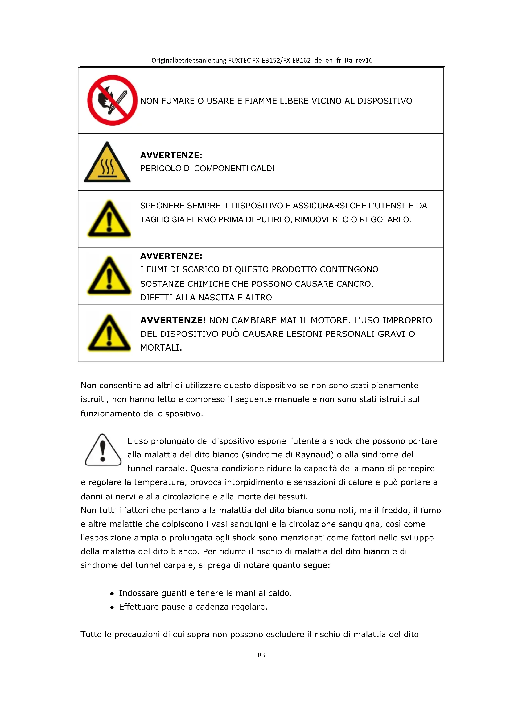 Non consentire ad altri di utilizzare questo dispositivo se non sono stati pienamente istruiti, non hanno letto e compreso il seguente manuale e non sono stati istruiti sul funzionamento del dispositivo. L'uso prolungato del dispositivo espone l'utente a shock che possono portare alla malattia del dito bianco (sindrome di Raynaud) o alla sindrome del tunnel carpale. Questa condizione riduce la capacità della mano di percepire e regolare la temperatura, provoca intorpidimento e sensazioni di calore e può portare a danni ai nervi e alla circolazione e alla morte dei tessuti. Non tutti i fattori che portano alla malattia del dito bianco sono noti, ma il freddo, il fumo e altre malattie che colpiscono i vasi sanguigni e la circolazione sanguigna, così come l'esposizione ampia o prolungata agli shock sono menzionati come fattori nello sviluppo della malattia del dito bianco. Per ridurre il rischio di malattia del dito bianco e di sindrome del tunnel carpale, si prega di notare quanto segue: ● Indossare guanti e tenere le mani al caldo. ● Effettuare pause a cadenza regolare. Tutte le precauzioni di cui sopra non possono escludere il rischio di malattia del ditoOriginalbetriebsanleitung FUXTEC FX-EB152/FX-EB162_de_en_fr_ita_rev16