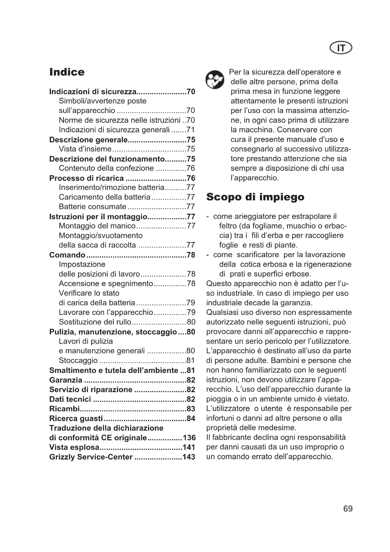 - Per la sicurezza dell’operatore e delle altre persone, prima della prima mesa in funzione leggere attentamente le presenti istruzioni per l’uso con la massima attenzio- ne, in ogni caso prima di utilizzare la macchina. Conservare con cura il presente manuale d’uso e consegnarlo al successivo utilizza- tore prestando attenzione che sia sempre a disposizione di chi usa l’apparecchio. Scopo di impiego - come arieggiatore per estrapolare il feltro (da fogliame, muschio o erbac- cia) tra i li d’erba e per raccogliere foglie e resti di piante. - come scaricatore per la lavorazione della cotica erbosa e la rigenerazione di prati e superci erbose. Questo apparecchio non è adatto per l’u- so industriale. In caso di impiego per uso industriale decade la garanzia. Qualsiasi uso diverso non espressamente autorizzato nelle seguenti istruzioni, può provocare danni all’apparecchio e rappre- sentare un serio pericolo per l’utilizzatore. L’apparecchio è destinato all’uso da parte di persone adulte. Bambini e persone che non hanno familiarizzato con le seguenti istruzioni, non devono utilizzare l’appa- recchio. L’uso dell’apparecchio durante la pioggia o in un ambiente umido è vietato. L’utilizzatore o utente è responsabile per infortuni o danni ad altre persone o alla proprietà delle medesime. Il fabbricante declina ogni responsabilità per danni causati da un uso improprio o un comando errato dell’apparecchio. Traduzione della dichiarazione di conformità CE originale p. 136